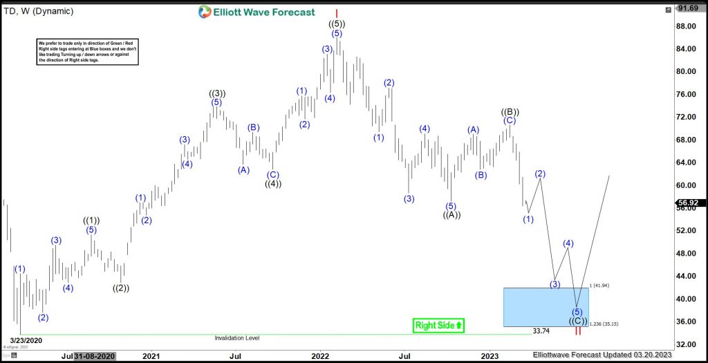 TD ended wave I as impulse sequence at $86.02 high & below there, it correcting lower in zigzag sequence in II. It confirmed the lower low sequence in daily, expecting weakness in ((C)) leg of II.