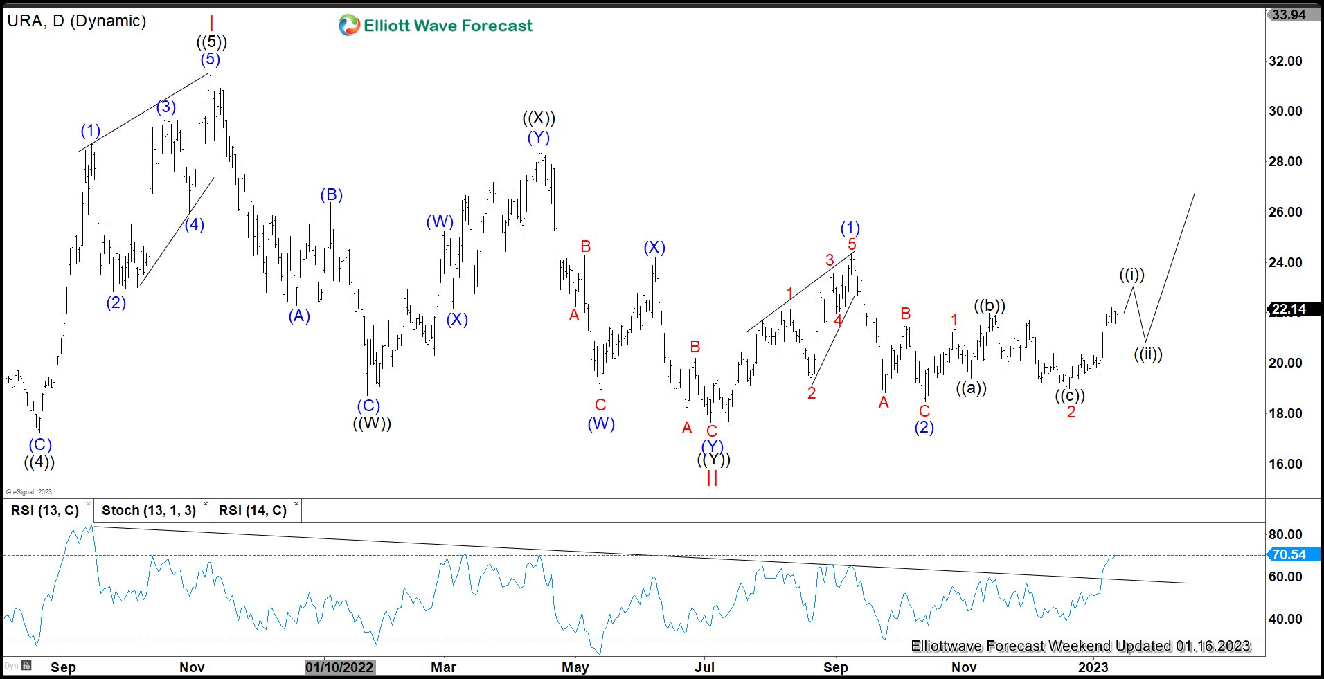Uranium ETF (URA) Monthly Chart above shows that the instrument has ended wave ((II)) pullback at 6.95 and now looking to do the next leg higher. Up from wave ((II)), wave I ended at 31.6 and pullback in wave II is proposed complete at 17.65. Expect the ETF to continue extending higher in wave III as far as it stays above wave II low at 17.65, and more importantly above wave ((II)) low at 6.95.
