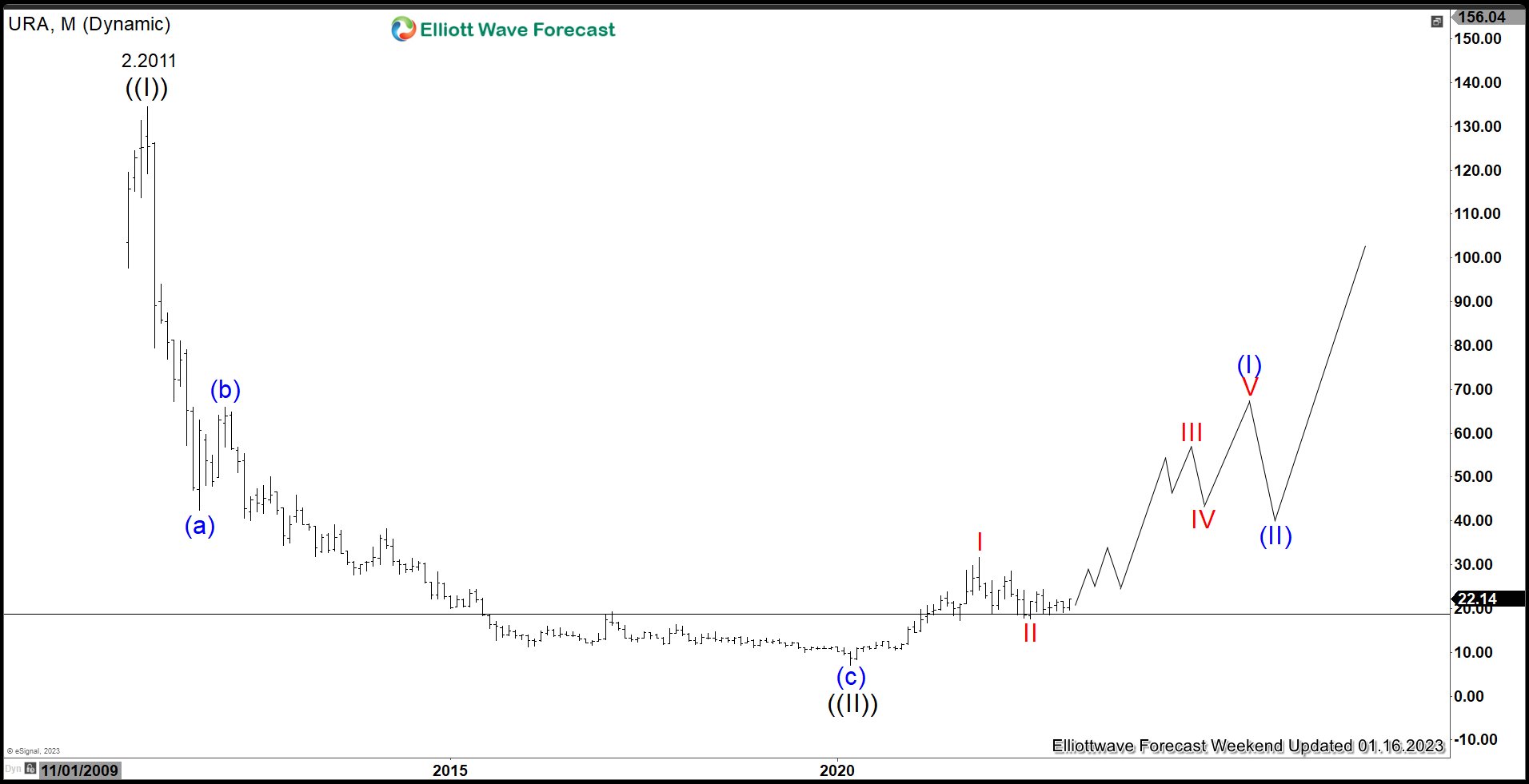 Uranium ETF (ticker: URA) spent the entire 2002 doing correction but this year it is ready to resume higher. This ETF invests in Uranium as well as several mining companies. With many countries looking for alternatives to fossil fuel, Uranium presents a viable alternative. Last year, there was a flurry of news about different countries announcing the building of new nuclear plants. Demand should pick up in the coming years. Below we will see the technical outlook of URA using Elliott Wave.
