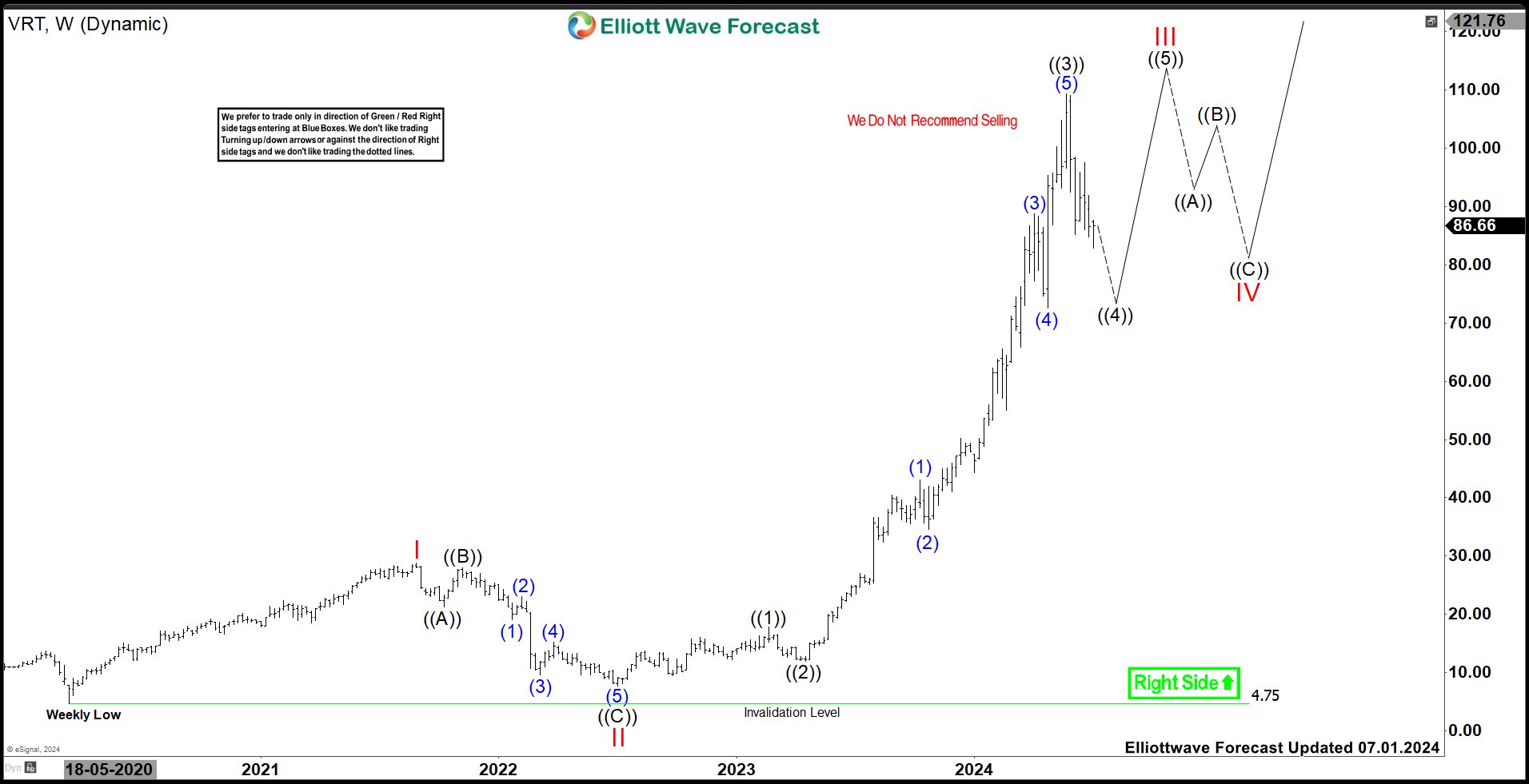 In Weekly sequence, VRT favors upside in III of (I) as impulse Elliott wave sequence since all time low of $4.75. Currently, it favors corrective pullback in ((4)) towards $73.40 – $58.38 area against April-2023 low before it should resume higher.