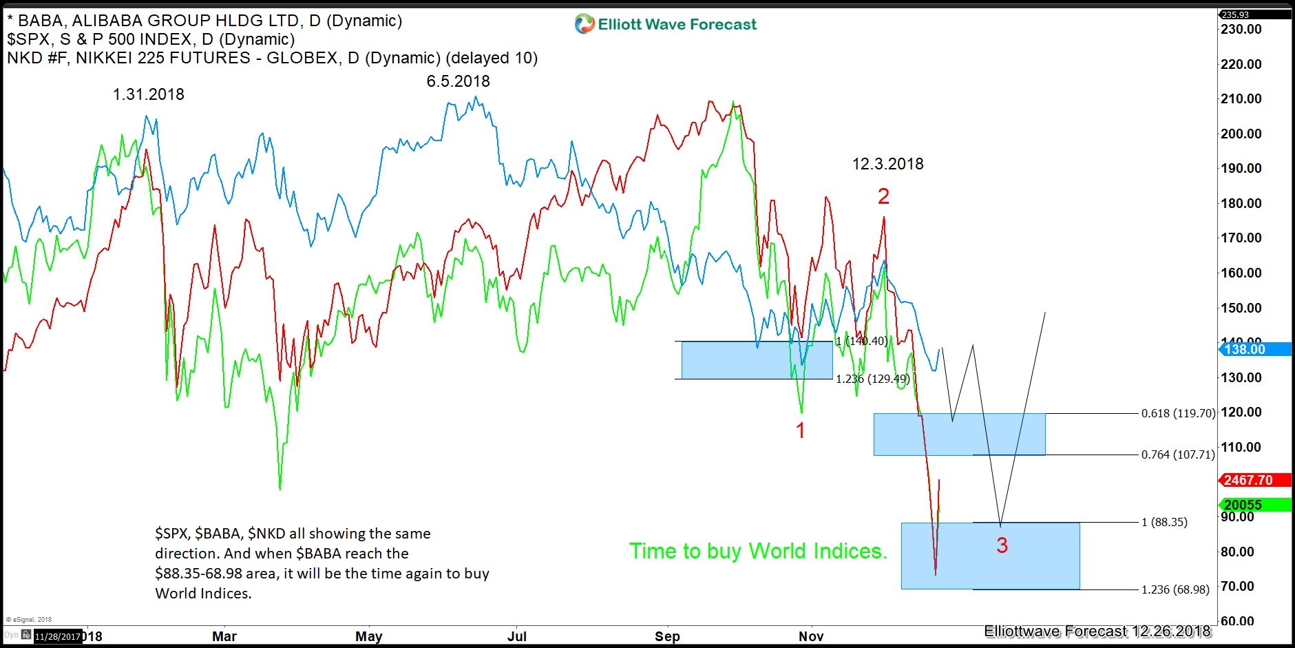 In the last chart you can see an overlay of SPX, BABA and the Nikkei Index. All are trading in the direction lower. And once BABA reached the 88.35-68.98 area (blue box) it will be yet the time again for us to buy the World Indices again.