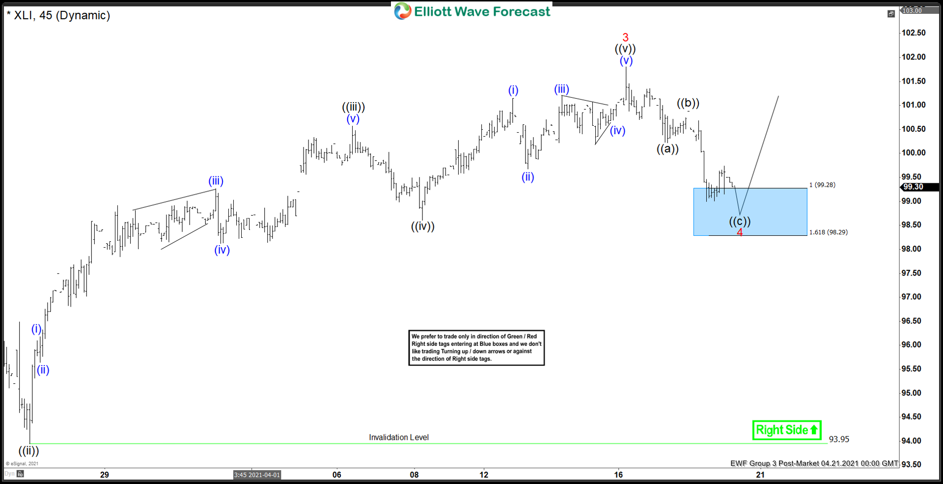 The ETF then pulled back lower into the blue box. We see black waves ((a)) and ((b)) completed in 4. We expected wave ((c)) lower into the blue box to complete the correction. The right side is upside against black wave ((ii)) lows at 93.95. And therefore we bought the ETF at the blue box.