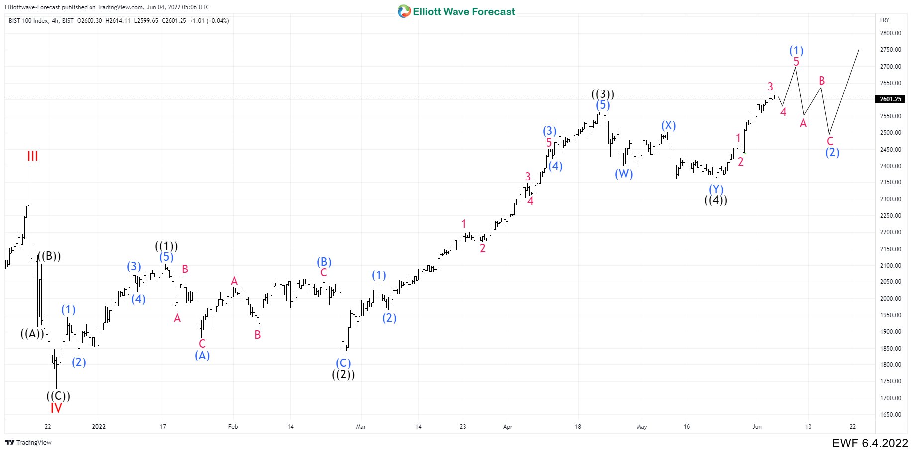 The XU100 started a rally from the end of December 2021. While other stock indices around the world have had a negative year so far; for example, the SPX has lost 13.80%, the BIST 100 has gained 40.00%. As we see on the chart, the rally that started from wave IV at 1727 shows a 5-wave structure, forming an impulse according to the Elliott wave theory. Wave ((1)) ended in 2105. The corrective wave ((2)) did a flat structure (A), (B) and (C) ending in 1826.