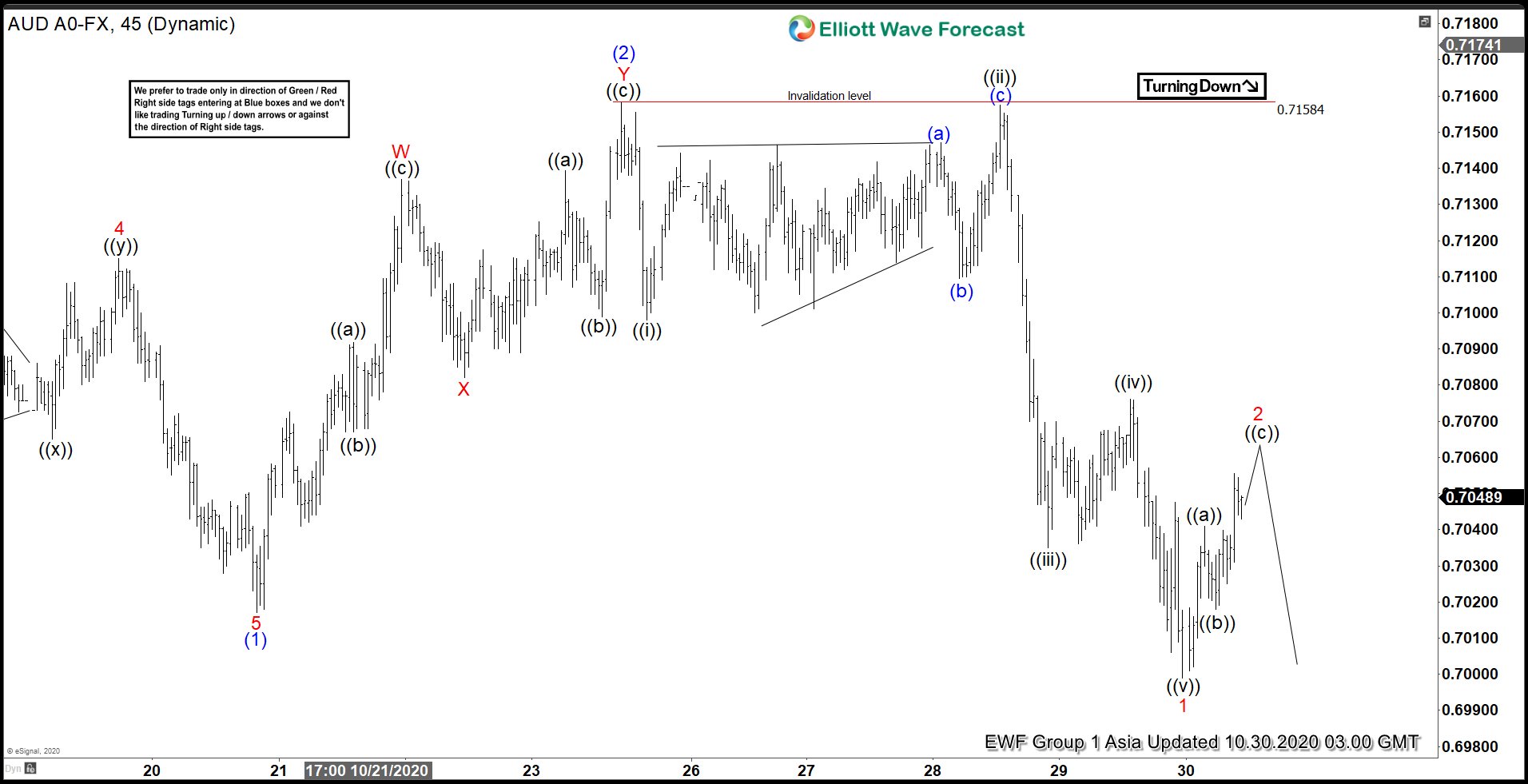 AUDUSD shows an incomplete sequence from September 1 peak favoring further downside. The decline from there is unfolding as a zigzag Elliott Wave structure. Down from September 1 peak (0.741), wave ((A)) ended at 0.7 and wave ((B)) ended at 0.724. Pair is currently within wave ((C)) lower and the subdivision of this wave ((C)) is in 5 waves, as 45 minutes chart below shows.