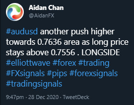 I also posted the BUY/LONG trade setups entry on social media @AidanFX  “AUDUSD BUY 0.7554 SL 0.7514 TP 0.7594” on December 22/2020 and “AUDUSD another push higher towards 0.7636 area as long price stays above 0.7556. LONGSIDE.” on December 28/2020