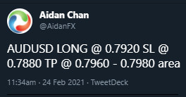 I posted the AUDUSD buy trade on social media @AidanFX  “AUDUSD LONG at 0.7920 Stop Loss at 0.7880 TP at 0.7960 – 0.7980 area.“