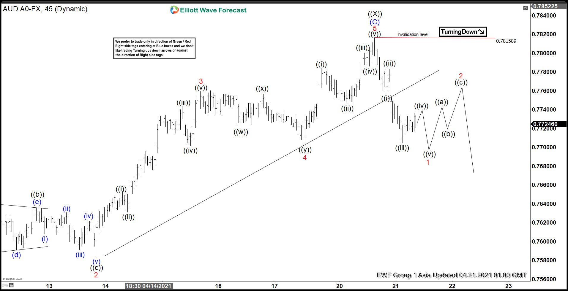 Short term Elliott wave view in AUDUSD suggests the rally from March 26 low ended as an expanded Flat Elliott Wave structure. Up from March 25 low, wave (A) ended at 0.7664 and wave (B) ended at 0.7528. Up from there, wave 1 of (C) ended at 0.7677 and wave 2 of (C) ended at 0.7583. The short term 45 minutes chart shows the rally starting from wave 2. Wave 3 of (C) ended at  0.7761, pullback in wave 4 of (C) ended at 0.7702 and final leg wave 5 of (C) ended at 0.7815. This also completed wave ((X)) in higher degree.