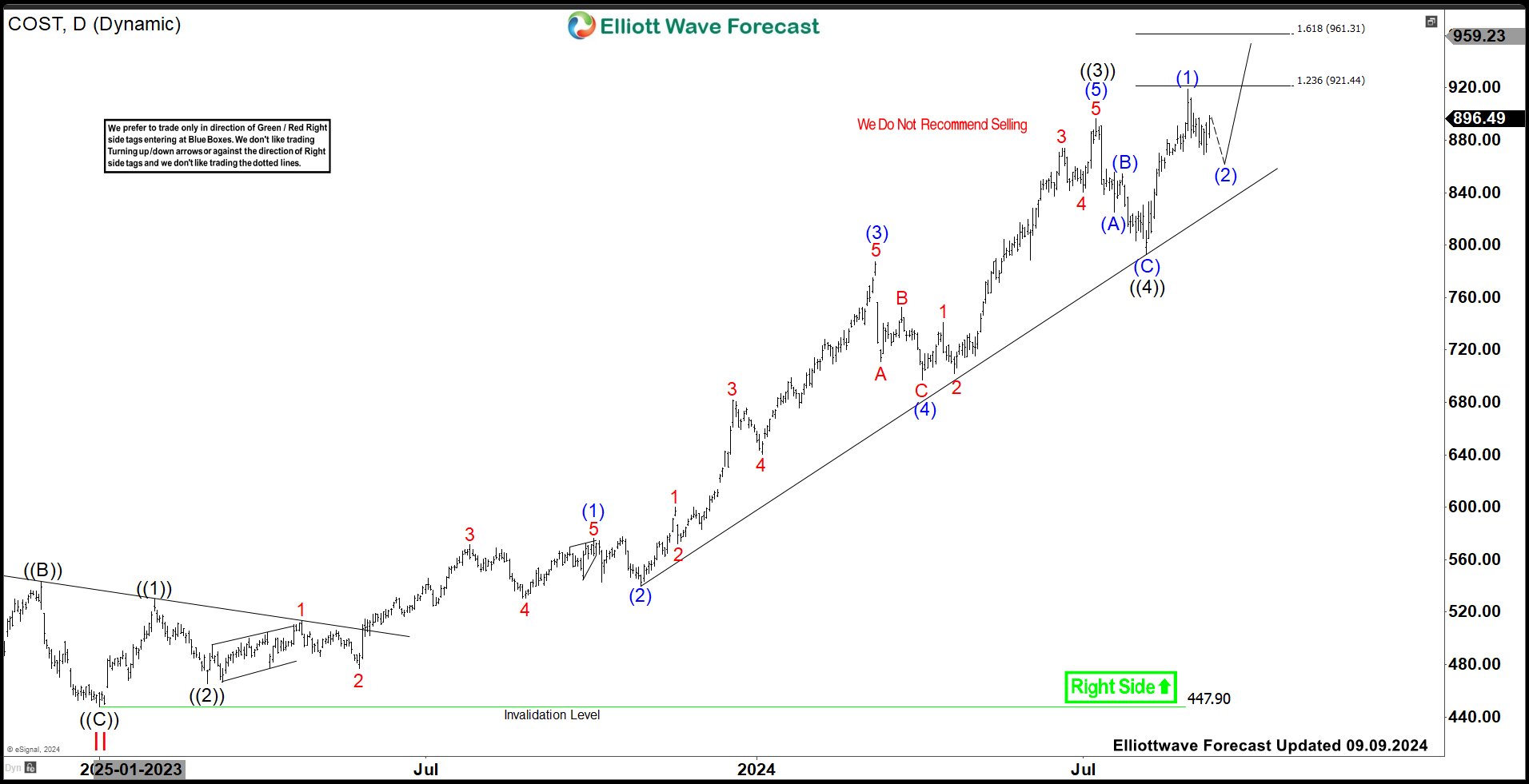 As shown in the previous article dated 9.09.2024, COST favors upside in ((5)) of III from August-2024 low. It already broke above ((3)) high & expected few more highs to finish the III as long as remain above daily price trendline.
