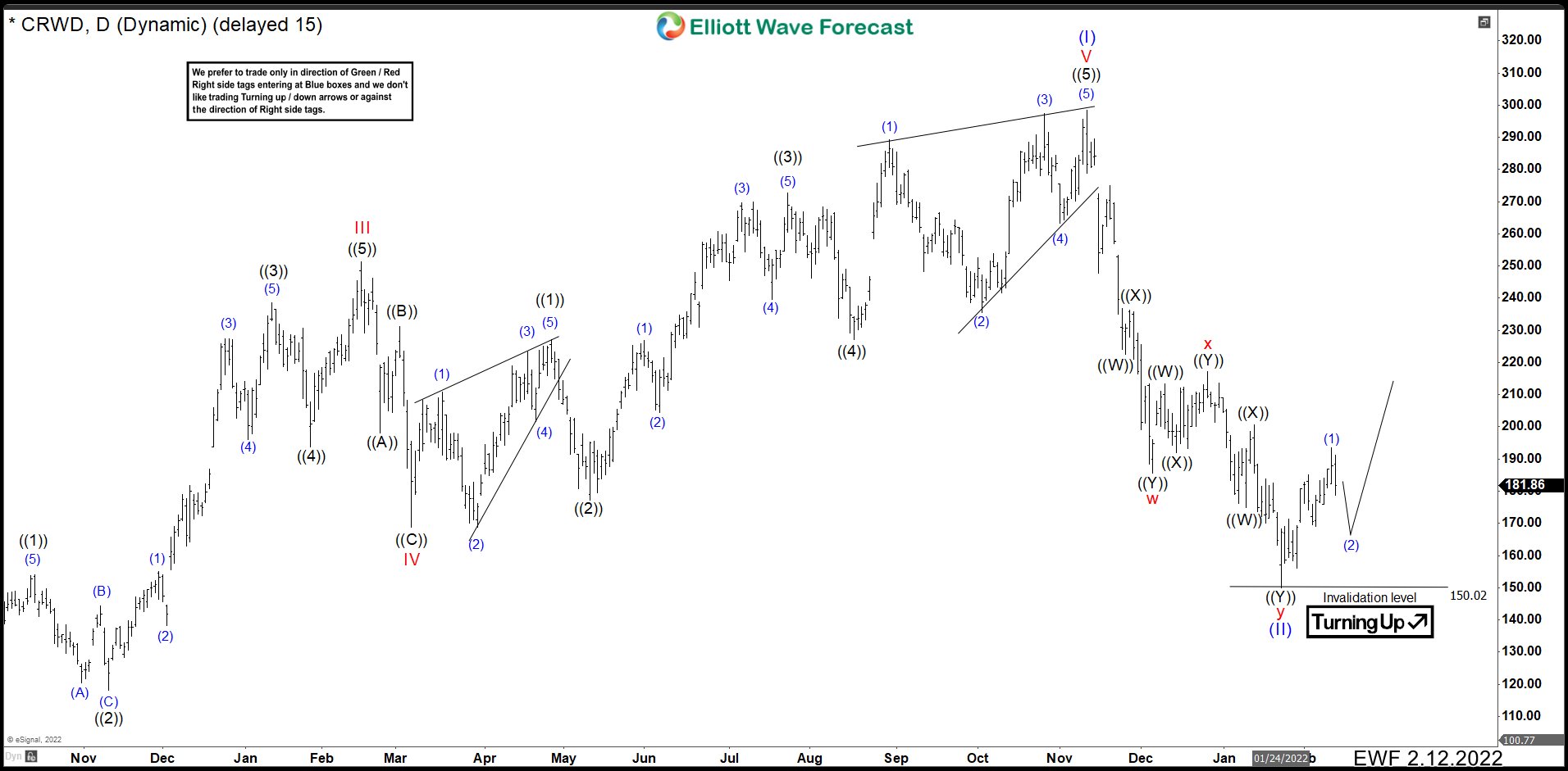 The chart above shows the daily view that we forecast 3 years ago. We were expecting to end an very important market cycle in the blue box area between 303.60 – 271.69. This cycle would end an impulse on CRWD since it listed on the stock exchange. Once the impulse would end as wave (I), we expected a big correction as wave (II). (If you want to learn more about Elliott Wave Theory, follow these links: Elliott Wave Education and Elliott Wave Theory).