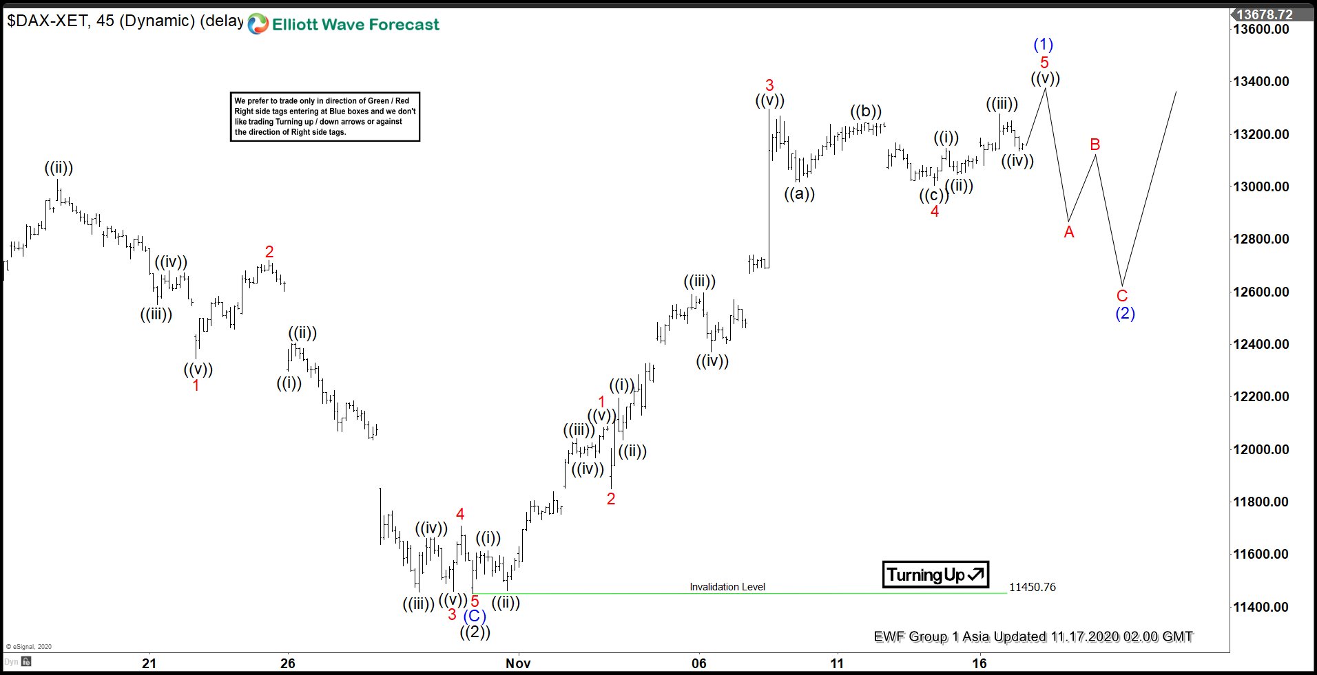 Short term Elliott Wave view on DAX suggests that the decline to 13309.4 ended wave ((4)). The Index has resumed higher in wave ((5)) with internal subdivision as a 5 waves impulse Elliott Wave structure. Up from wave ((4)) low, wave ((i)) ended at 13698.54 and wave ((ii)) pullback ended at 13403.74. Index then resumed higher again in wave ((iii)) towards 14114.44, pullback in wave ((iv)) ended at 14013.13, and final leg higher wave ((v)) ended at 14169.49. This completed wave 1 in higher degree.