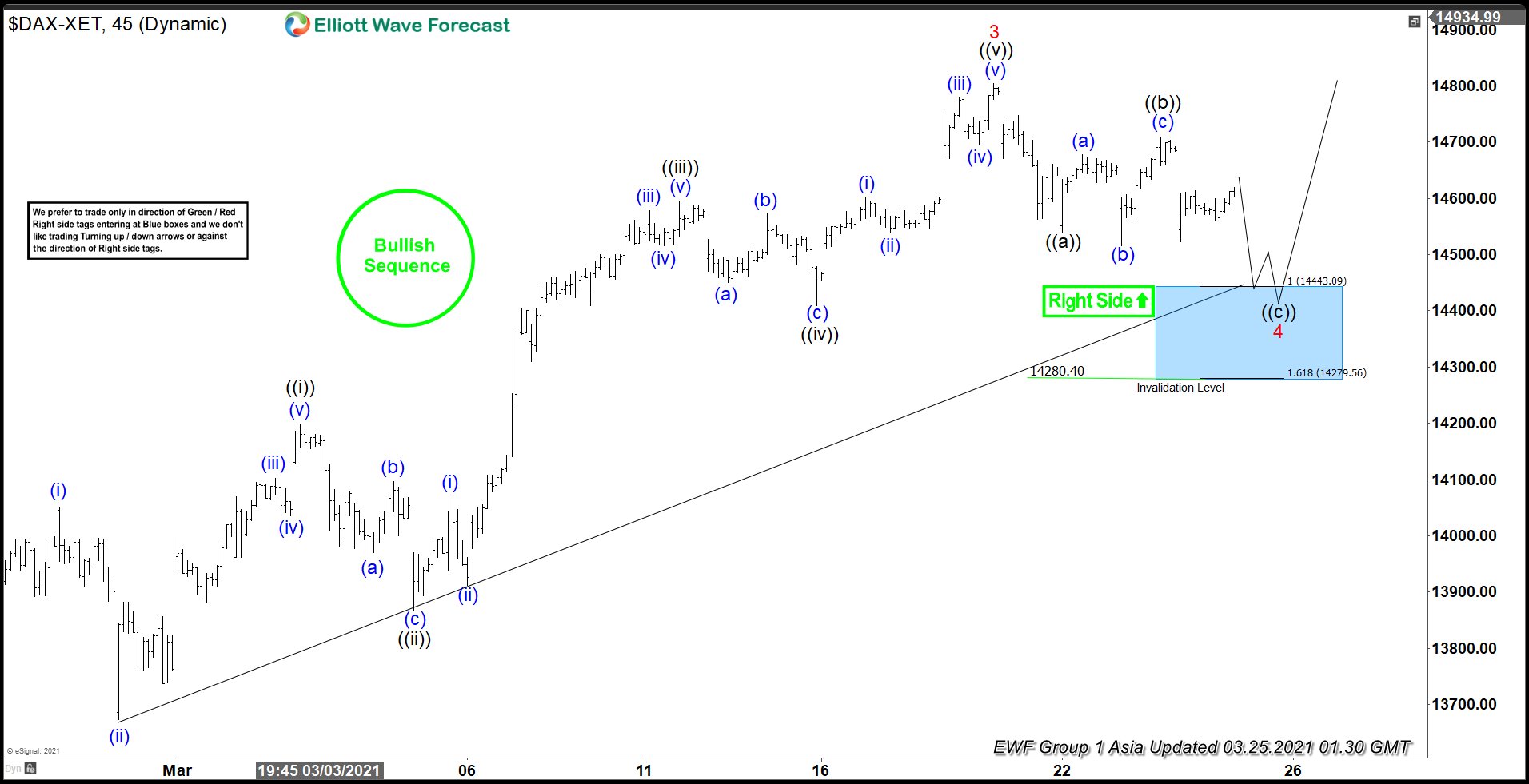 DAX Short term Elliott Wave View suggests that the rally from January 28, 2021 low is unfolding as a 5 waves impulsive Elliott Wave structure. The Index ended wave 3 of this impulsive rally at 14804.01. Internal of wave 1 unfolded as an impulse in lesser degree. Wave ((i)) of 3 ended at 14197.49, and pullback in wave ((ii)) of 3 ended at 13868.20. Index then resumed higher in wave ((iii)) of 3 at 14595.02, and pullback in wave ((iv)) of 3 ended at 14409.35. Final leg wave ((v)) of 3 ended at 14804.01
