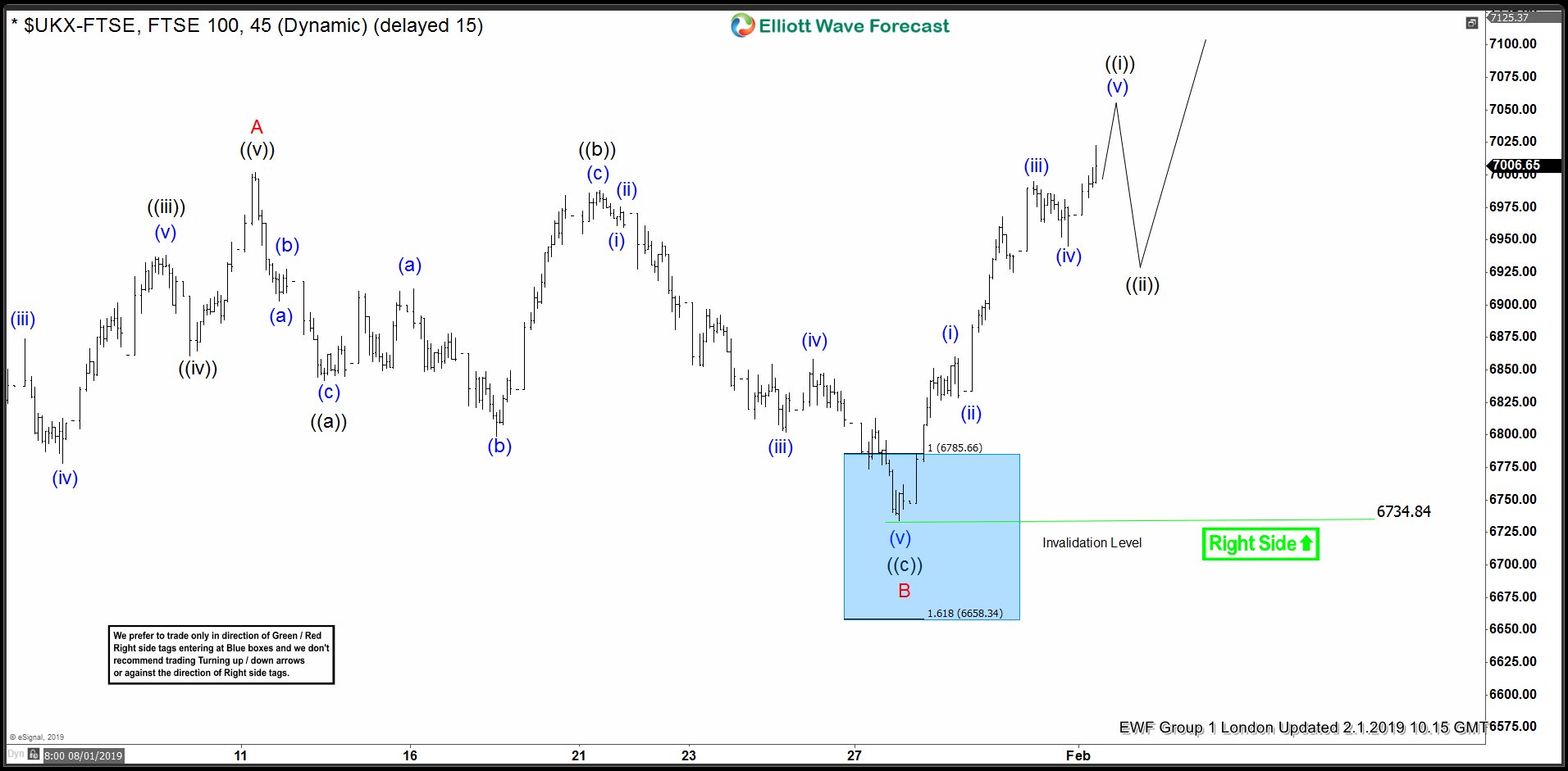 FTSE short-term Elliott wave view suggests that a rally from 12/27/2018 low (6536.53) is unfolding as a zigzag structure where initial rally to 7001.94 high ended wave A in 5 waves structure. Down from there, wave B unfolded as a Flat correction where wave ((a)) ended at 6841.74 low. Wave ((b)) bounce ended at 6987.93 high in lesser degree flat correction. Wave ((c)) ended in lesser degree 5 waves at 6732.33 low, which also completed wave B pullback. After reaching the blue box area at 6785.66-6658.34 100%-161.8% Fibonacci extension area of ((a))-((b)).