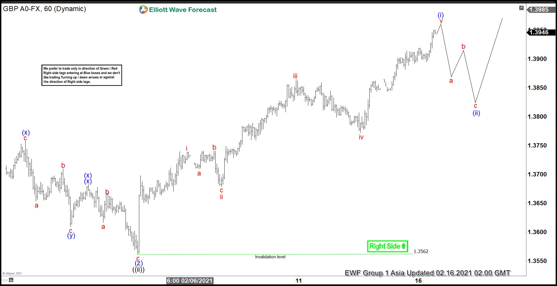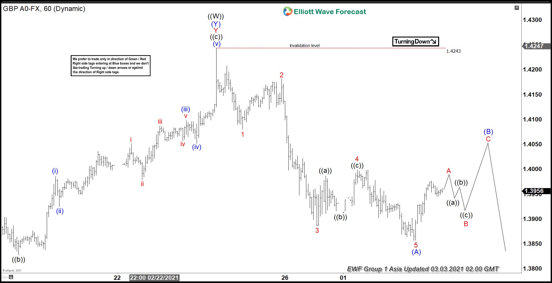 Pair then extended lower in wave 3 towards 1.388, and wave 4 bounce ended at 1.4. The last leg of the impulse wave 5 ended at 1.3857 and this completed wave (A) of the zigzag. Wave (B) rally is currently in progress to correct the 5 waves decline from February 24 high (1.4239). Internal of wave (B) is proposed to be unfolding as a zigzag where the first leg wave A should end soon with a marginal high. Pair should then pullback in wave B then turn higher again in wave C to end wave (B) correction. While wave (B) rally fails below February 24 pivot at 1.4239, expect pair to turn lower again in another 5 waves within wave (C) to complete wave ((X)) pullback.