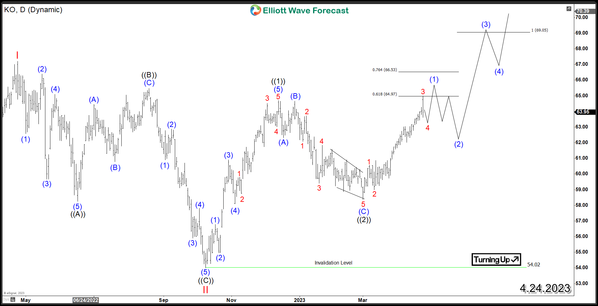 Another way to view the chart is as a nest, multiple 1-2 waves forming over time. Currently, we may be in wave I-II. Unlike the first scenario, this one implies a shallower correction. Therefore, wave II could drop only to the 60–50 zone before the rally resumes. If the ending diagonal holds, this setup is ideal. KO has shown strong bullish behavior with minor pullbacks, unless disrupted by major events like a recession or the 2020 pandemic. Additionally, we must consider a possible extension in the ending diagonal. This lies between 76.56 – 81.49 area. If KO reaches this zone without correcting and maintains the diagonal structure, the pullback may occur there. However, if price breaks above 81.49, the diagonal will fail, and KO would continue higher.
