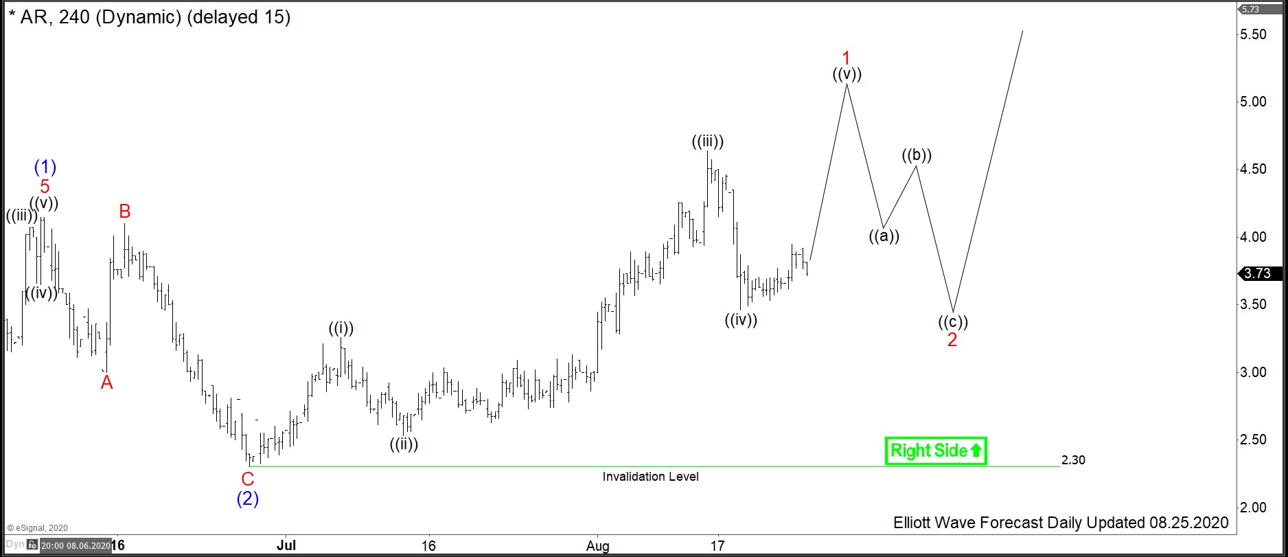 The 4H chart below shows the $AR shares price action in more detail. From the June lows at 2.30, the stock price has advanced in waves ((i)) through ((iii)) of red wave 1. Consequently, after a pullback in wave ((iv)), an extension higher in wave ((v)) of 1 should take place. Later on, expect a pullback in wave 2 to find support in 3, 7 or 11 swings above 2.30 lows for a possible acceleration in wave 3 of (3).