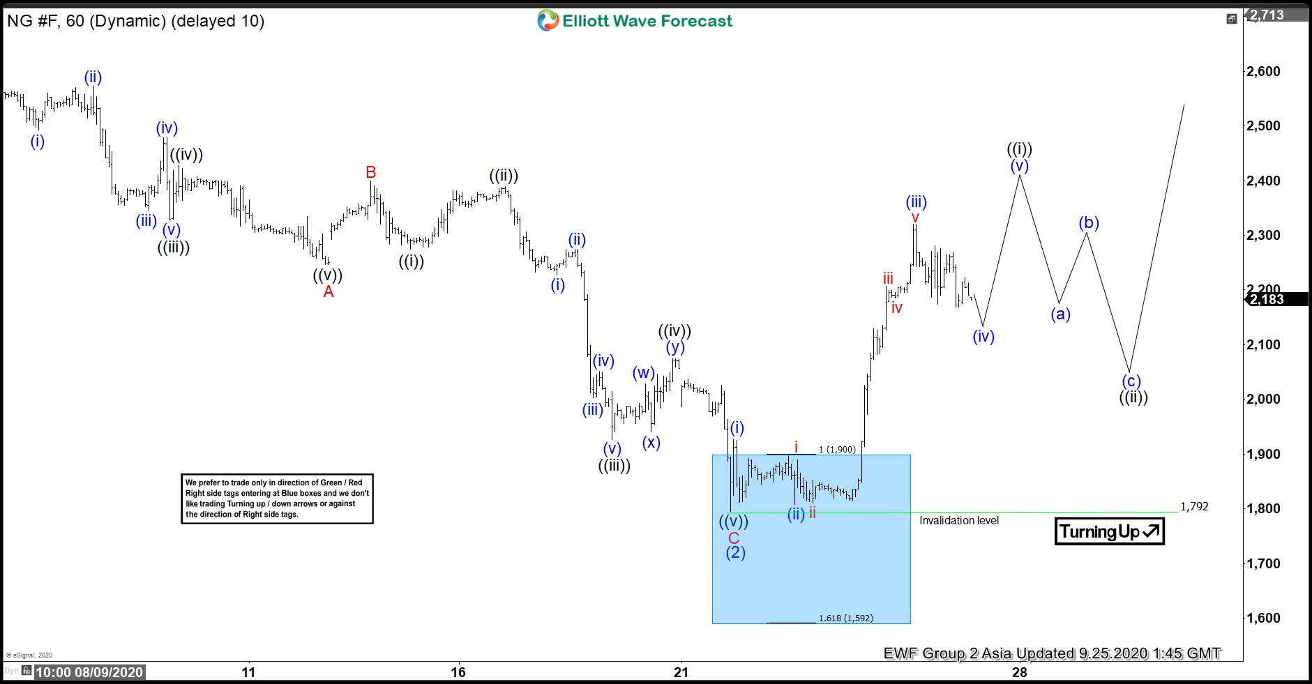 Above is the 1 hour Elliott Wave Chart from 9/23/2020 Asia update. In which, Natural gas made a pullback in wave (2) to correct the cycle from 6/25/2020 low. The internals of that pullback unfolded as a zigzag structure where wave A ended at $2.246 low. Wave B bounce ended at $2.399 high and wave C managed to reach $1.899- $1.590 100%-161.8% Fibonacci extension area. From there, buyers were expected to appear looking for another extension higher or for 3 wave reaction higher at least. Therefore, our members knew that buying at blue box area remains the preferred path for a 3 wave bounce at least.
