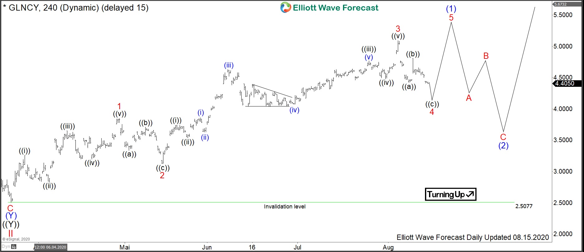 The 4H chart below shows in more detail the advance higher from the March lows at 2.508. The cycle up remains still intact and might be currently in the wave 4 of (1). After a pullback in wave 4, expect another push higher in wave 5 to end the march cycle. Medium-term, a correction lower in wave (2) should find support above the March lows in 3, 7 or 11 swings. Then, an extension higher in wave (3) to new highs should follow or $GLNCY should produce another leg higher at least.