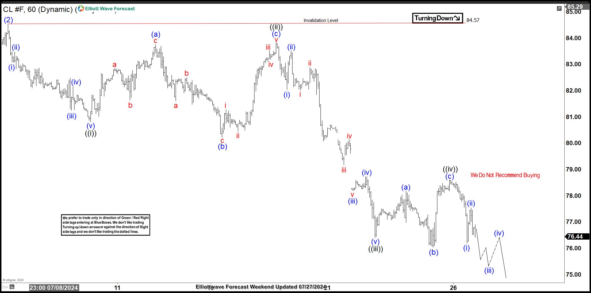 Thus, the current decline is wave (3) of ((3)), which could extend to at least $70 in the coming weeks. As long as the price remains below the June 2024 high of 84.57, our members understand why we favor staying on the sell-side. However, before looking for a SHORT opportunity, we would like to see the low of wave (1) breached. Afterward, we can sell bounces in 3, 7, or 11 swings.