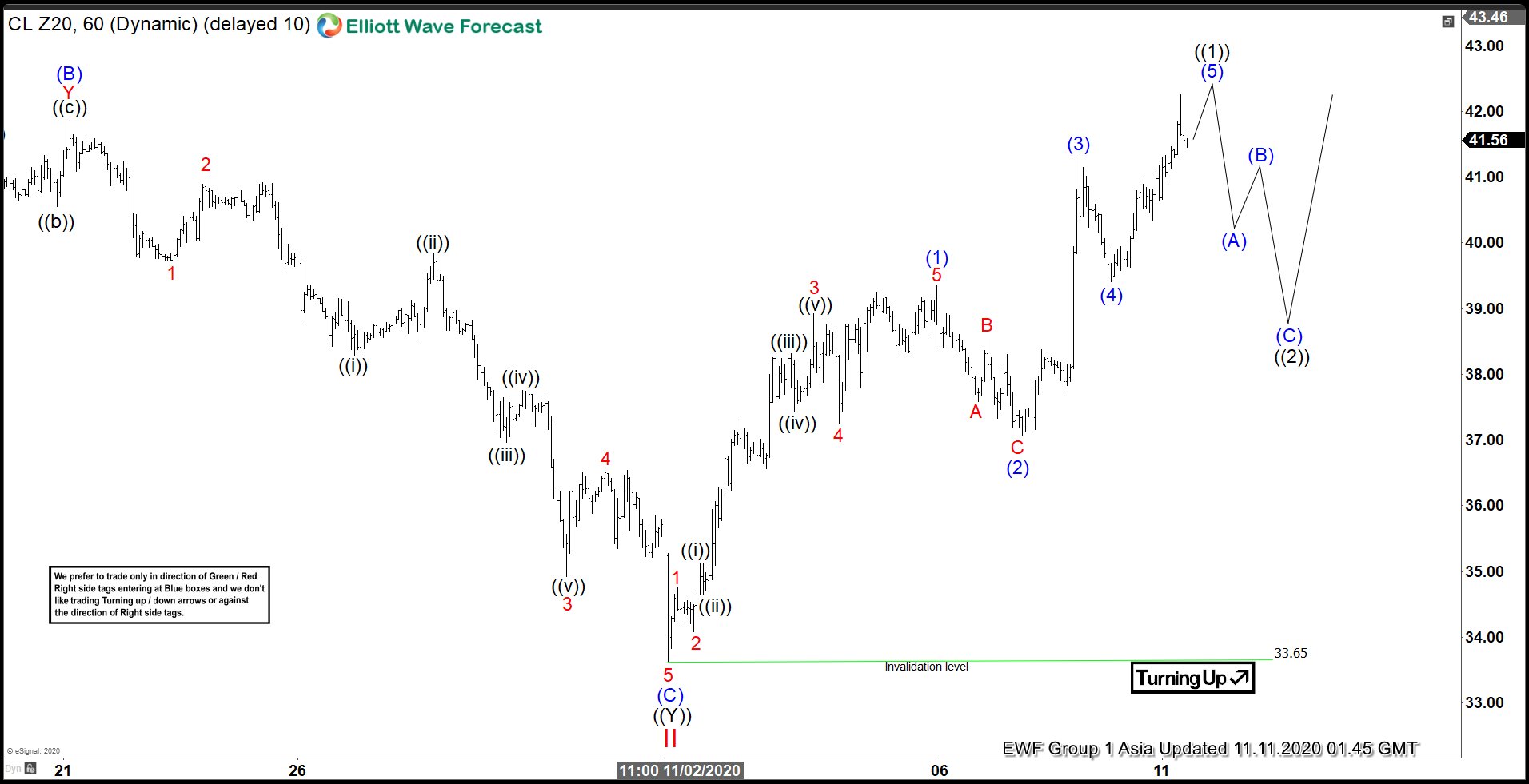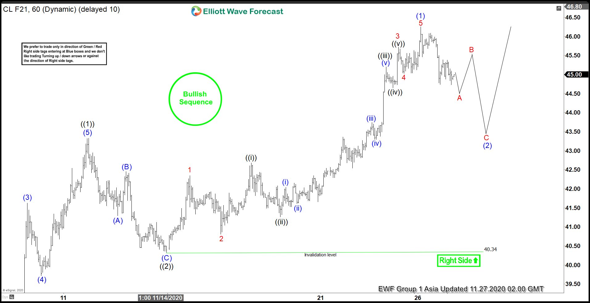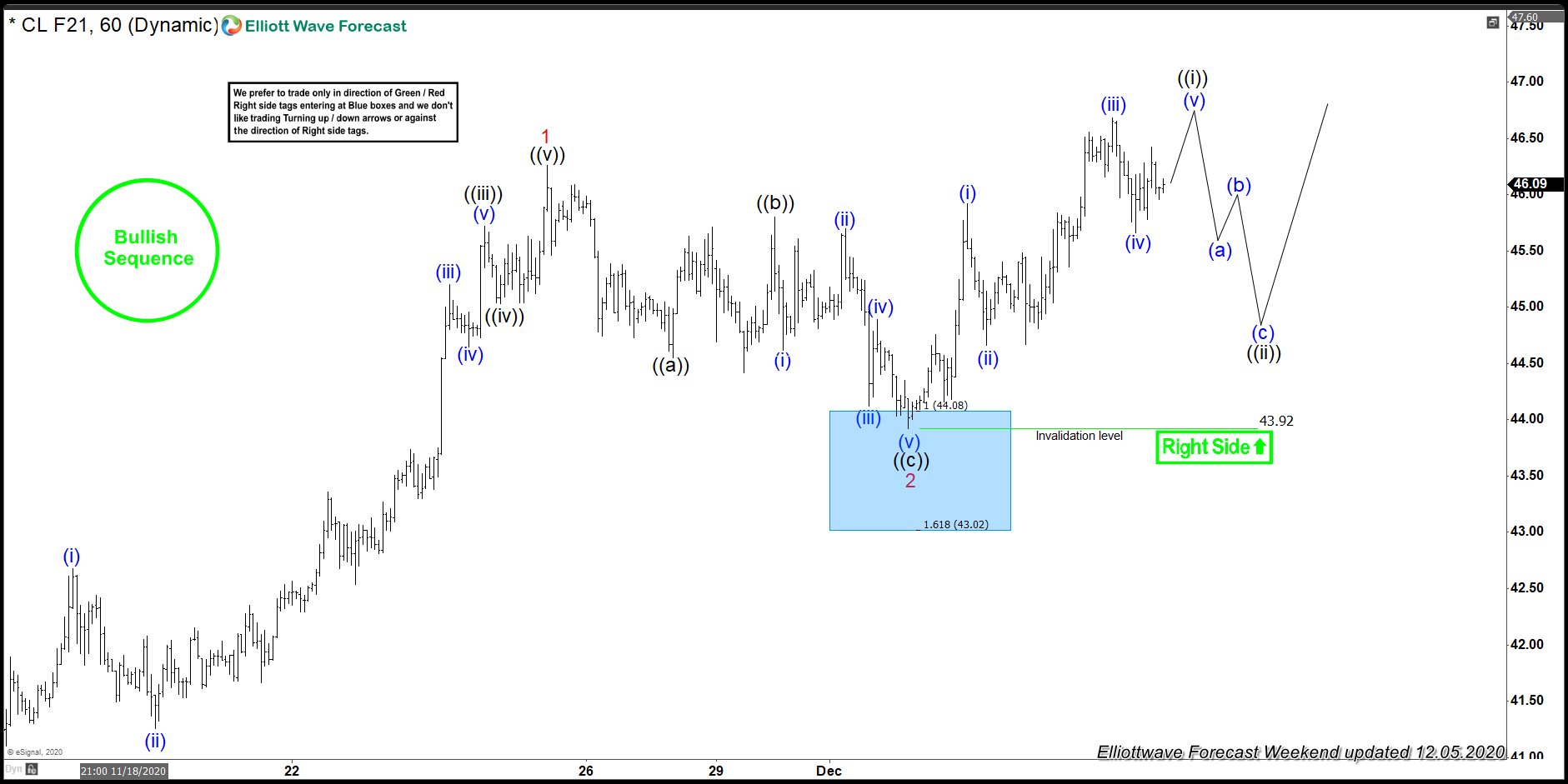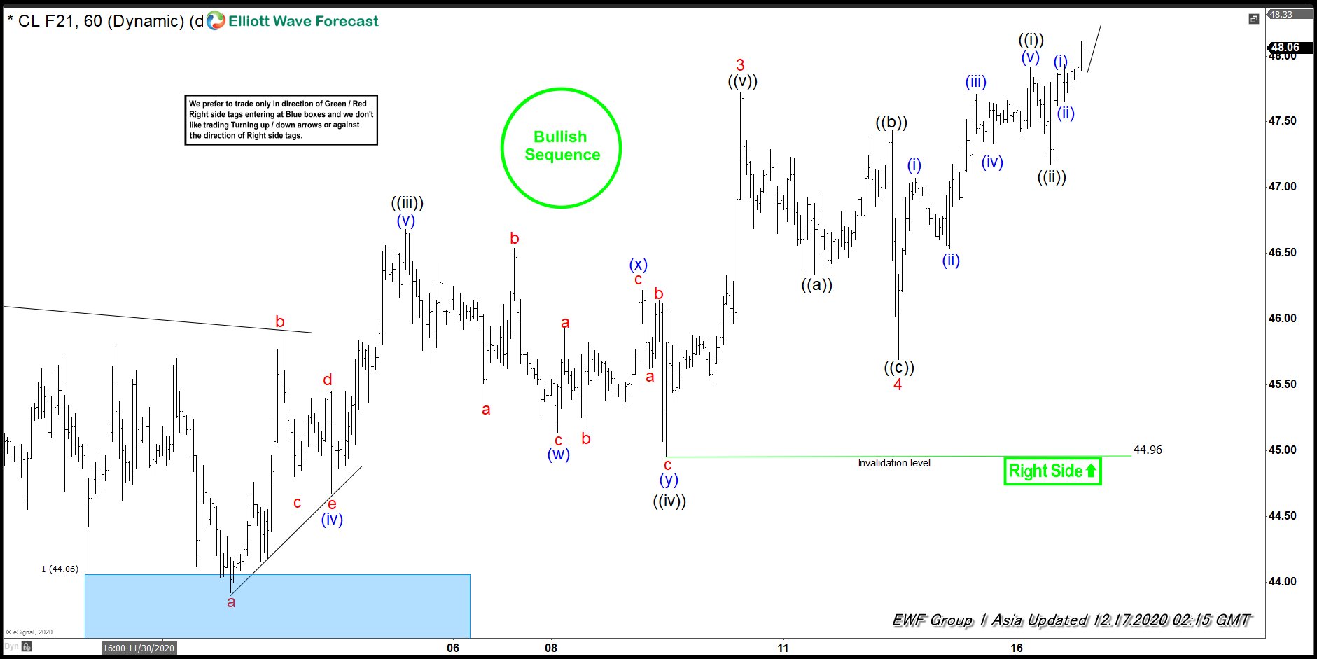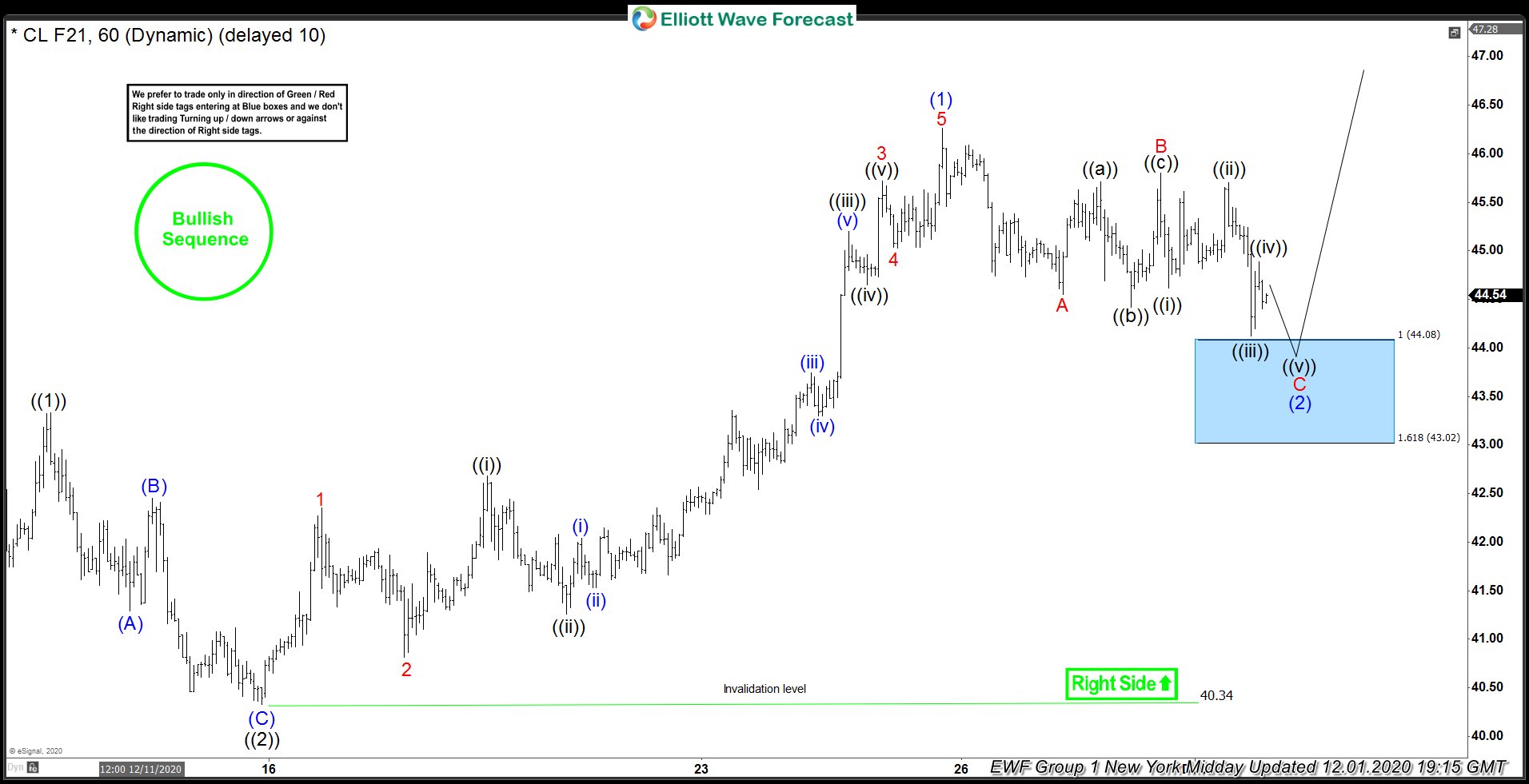 Short term Elliott wave view in OIL ( $CL_F) suggests that the main cycle from April 2020 low remain bullish to the upside favoring more upside. Near-term, the rally from 01 November 2020 low unfolded as an impulse sequence where wave 3 of (1) ended at $47.88 high. While wave 4 ended at $45.88 low, wave 5 ended at $49.42 high. Thus completed wave (1) at $49.42 high. Down from there, the correction in wave (2) pullback remains in progress & expected to find buyers in a 3 or 7 swing structure.