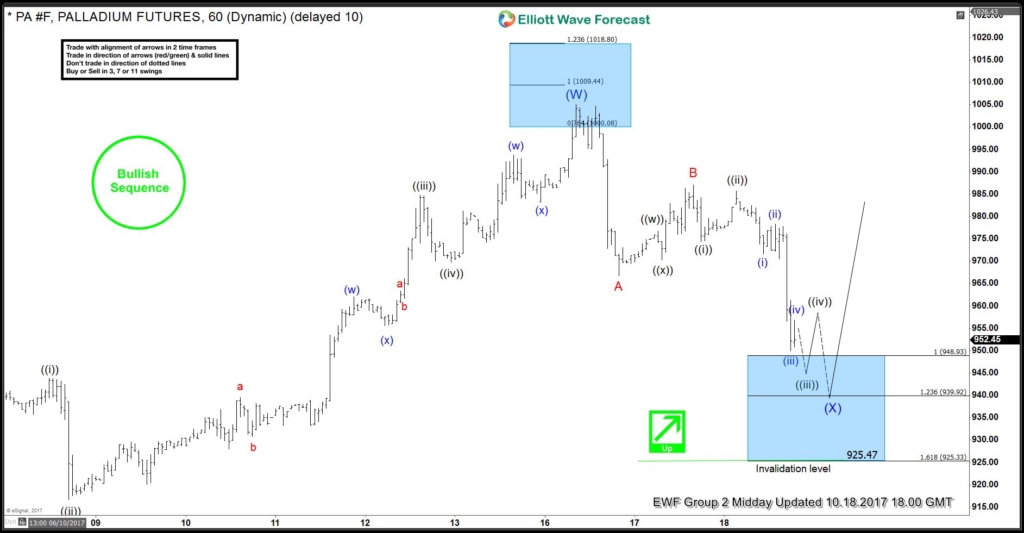 The metal gave us the reaction higher as expected from the area in between 949.06-925.45 100%-1.618% Fibonacci extension area of A-B and ended the wave C of (X) at 942.90 on 10/19 low. Afterwards, metal broke to new highs suggested that the instrument started the intermediate (Y) leg higher already. The 1 hour NY updated chart from 11.08 above, is showing metal breaking higher and showing another bullish sequence within the cycle from 9/20 low. And was looking to start the Minor wave B pullback from 1016.13-1023.63 area before further upside. If interested in latest 1hr, 4hr, Daily & Weekly path then Try 14-day  Free Trial & get the latest market update in Palladium & other commodities as well.