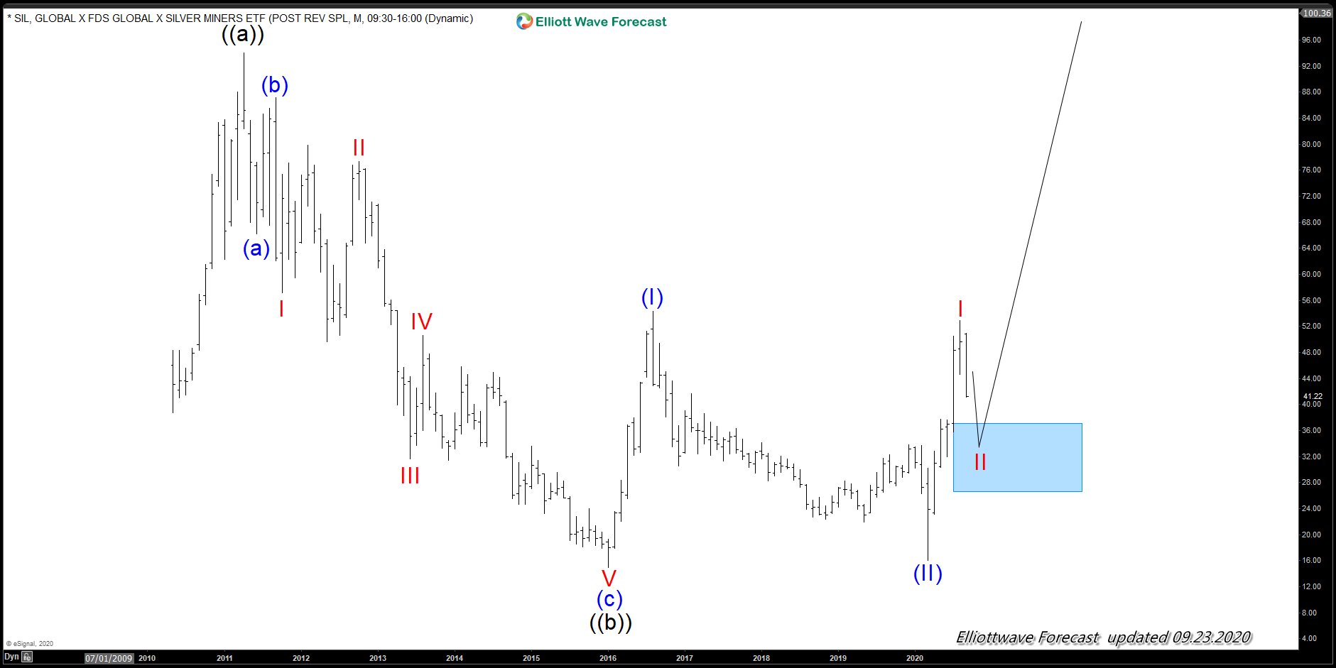 Wave 3 is the most powerful wave in an Elliott Wave Structure. In this article, we will be looking at an opportunity to catch wave 3 in Silver Miners ETF and also look at Silver and Gold charts to further support the view. The Global X Silver Miners ETF (SIL) provides investors access to a broad range of silver mining companies. The Global X Silver Miners ETF (SIL) seeks to provide investment results that correspond generally to the price and yield performance, before fees and expenses, of the Solactive Global Silver Miners Total Return Index. Let’s take a look at the Monthly chart of Silver Miners ETFs.