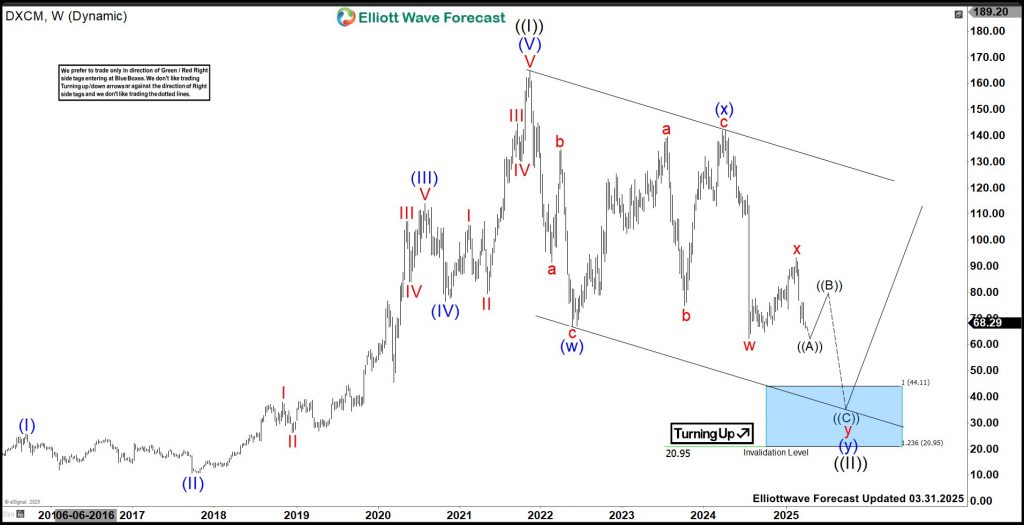 Elliott Wave pattern suggest short-term strategies, such as selling during rebounds in three, seven, or eleven swings, as long as the stock remains below February-2025 high of $93.25, once it breaks below $62.34 low. Alternatively, if the stock surpasses $93.25 while holding above July-2024 low, a potential double correction could manifest. For long-term investments, the next blue box area in wave y might offer opportunities when the stock approaches this zone in the weekly chart. Navigating DXCM’s technical patterns demands careful observation & a strategic approach for investors aiming to capitalize on potential market movements.