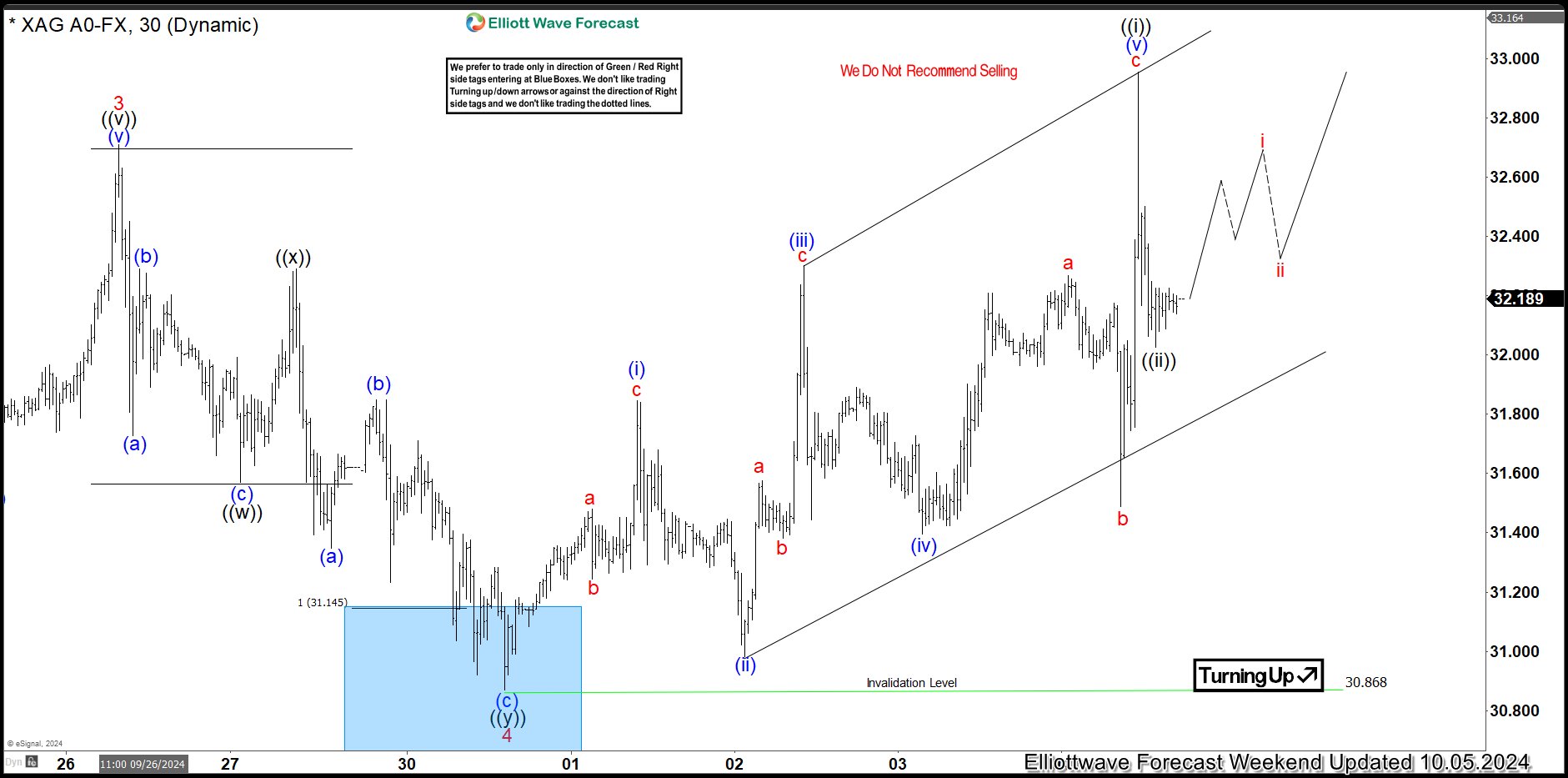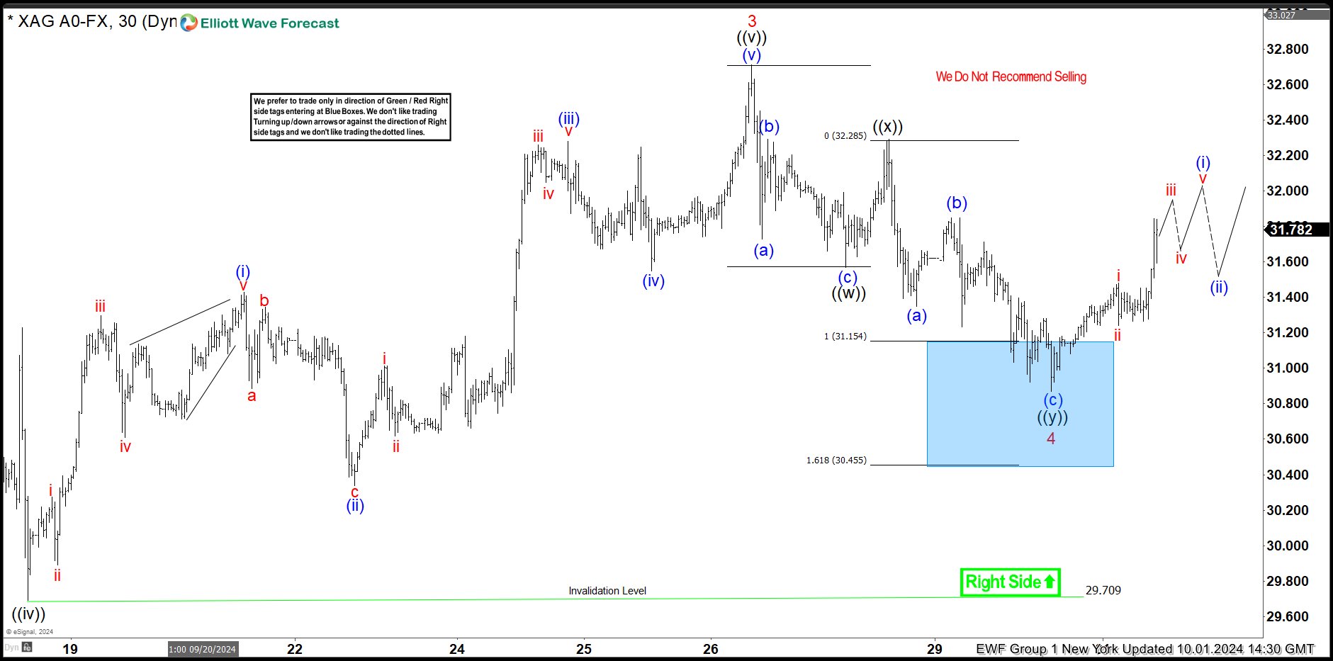 The commodity is giving us wave (iv) blue correction. The pull back has incomplete structure at the moment. Consequently, we are looking for another short term low toward the extreme zone ( Blue Box ).  However, we don’t recommend selling it. We expect it to attract buyers at the Blue Box zone. The commodity could make either rally towards new highs or a larger corrective bounce in three waves at least. Once the bounce reaches the 50% Fibonacci retracement level against the connector high – x red, we’ll secure our position by moving the stop-loss to breakeven.  Break below the marked invalidation level : 30.44 would invalidate the trade.