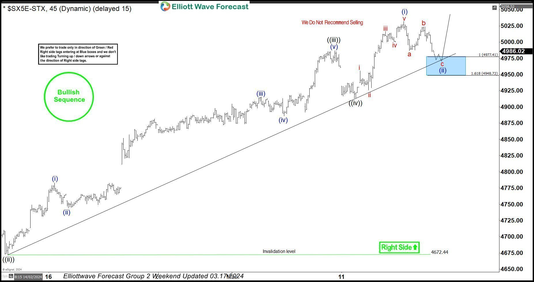 EUROSTOXX is showing bullish sequences within the cycle from the 4672.4 low, suggesting further strength ahead. Presently, the index is undergoing an intraday pullback (ii) in blue. The structure of this pullback remains incomplete, indicating short-term weakness towards the 4977.41-4948.7 area. We advise against selling $SX5E and instead favor the long side from the marked Blue Box (buying zone). Once $SX5E reaches our buying area, it should ideally either rally towards new highs or undergo a bounce in three waves alternatively. Once the bounce retraces 50% against the ‘b’ red, we will adjust our long positions to be risk-free by placing a stop loss at breakeven (BE).
