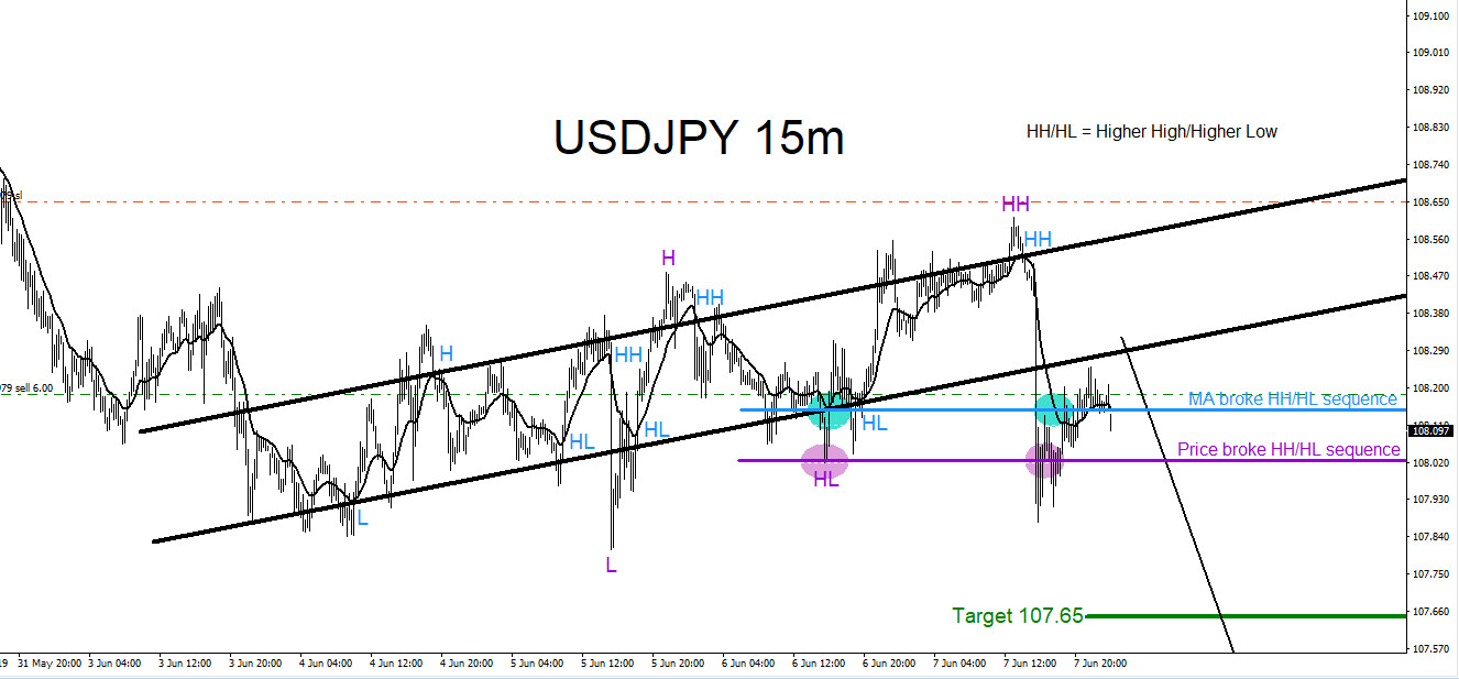 USDJPY 1 Hour Chart 6.28.2019: In the chart below, on June 28/2019 price reacts to a support/resistance zone (filter #1) that a possible bounce higher can happen. A reaction from this zone allows a trader to identify that this particular zone will be an important area where price will possibly signal which side it wants to continue moving on.