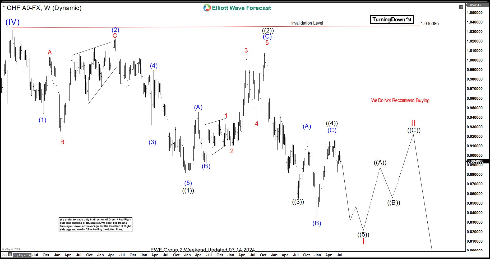 For USDCHF specifically, the bearish cycles began in October 2022 and January 2025. Since January, we have sold bounces at the extremes of 3, 7, or 11 swings. We highlight these extreme zones with blue boxes on our charts. For example, there was a clean 7-swing corrective bounce from July 1, 2025. When that bounce matured, we marked the blue box zone for selling. This setup was shared with members on August 9, 2025. From the August blue box, USDCHF fell over 330 pips. We wrote about it; read here. It even broke below the July low where the bounce started. As a result, we prepared for another corrective bounce to sell from.