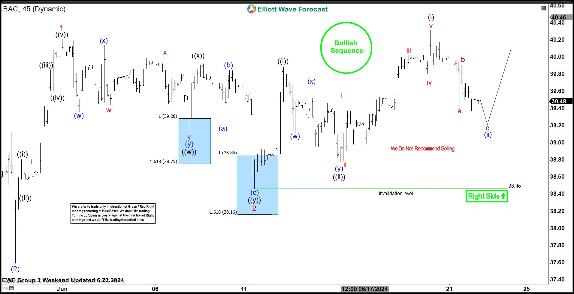 Hello fellow traders. In this technical article we’re going to take a look at the Elliott Wave charts charts of Bank of America Corp (BAC) Stock published in members area of the website. Our members are aware of the numerous positive trading setups we’ve had among Stocks and Indices recently. One of them is BAC , which made a pullback, that unfolded as an Elliott Wave Double Three Pattern. It completed clear 7 swings from the peak on June 3rd peak and concluded the correction right at the Equal Legs zone (Blue Box Area). In the following text, we’ll delve into the Elliott Wave pattern and trading setup.
