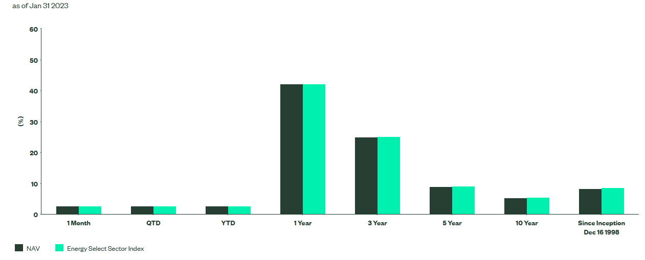 | Energy Select Sector Index | Jan 31, 2023 | 2.69 % | 2.69 % | 2.69 % | 42.23 % | 25.1 % | 9.03 % | 5.47 % | 8.56 % |