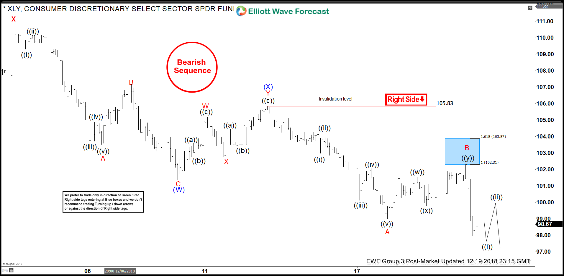 Technical based traders using EWF’s Blue Box System on 12/19/2018 executed a near perfect entry short in the Consumer Discretionary ETF – XLY before the FOMC rate decision. Prior to the actual trigger of the trade, Elliottwave-Forecast.com analysis showed our Group 3 Membership the ideal entry range. It is in these ranges of symmetrical extremes where highly probable directional reactions most often take place. And, like the reaction we see in XLY, continue to confirm our method of sequence analysis.