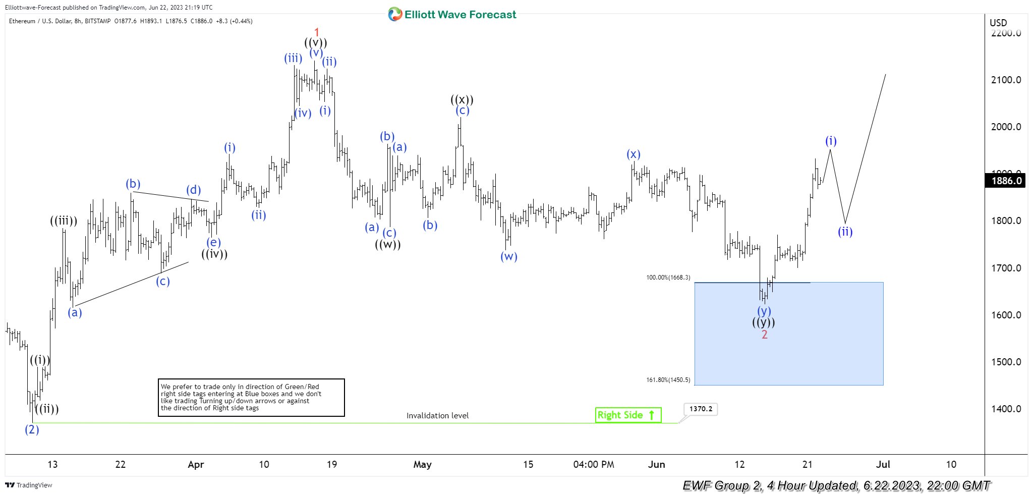Hello fellow traders. In this technical article we’re going to take a quick look at the Elliott Wave charts of ETHUSD published in members area of the website. As our members know, Ethereum has given us good buying opportunity recently . Our team recommended members to avoid selling , while keep favoring the long side and buying the dips against the 1370 pivot. We got correction that reached our buying zone. ETHUSD found buyers and made reaction from the blue box as expected. In the further text we are going to explain the Elliott Wave Forecast and trading strategy.