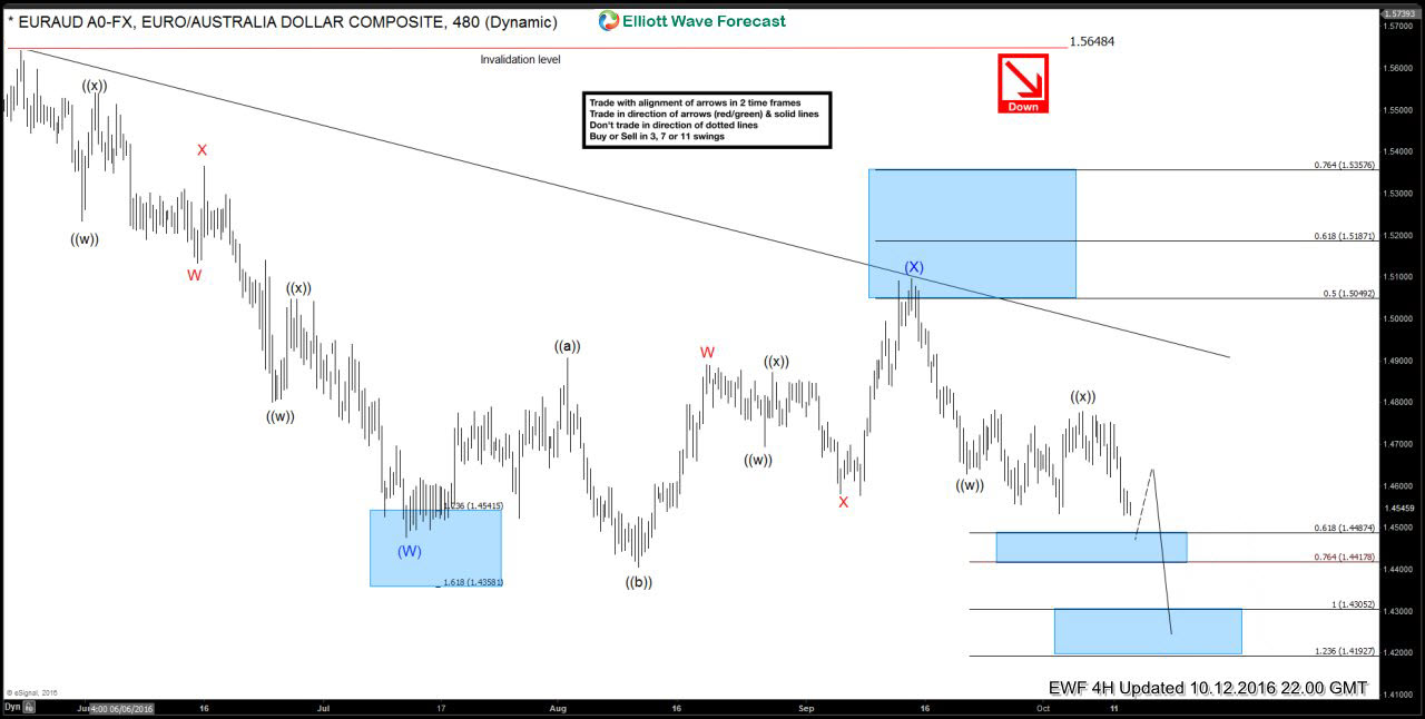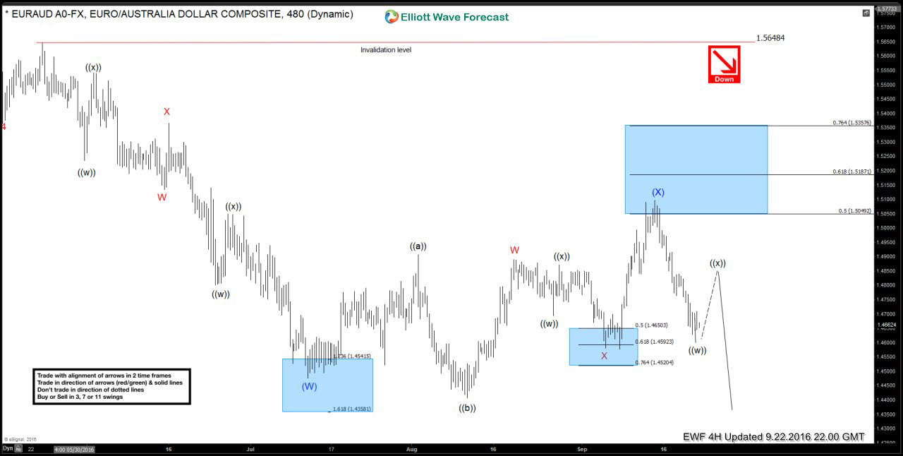 $EURAUD 9.22.2016 The pair made double as expected, reached proposed technical area and declined from there. Members who made entries at 50-61.8 fibs, already have short positions risk free. The pair is now expected to bounce and make ((x)) correction against the wave (X) blue peak before decline resumes again.