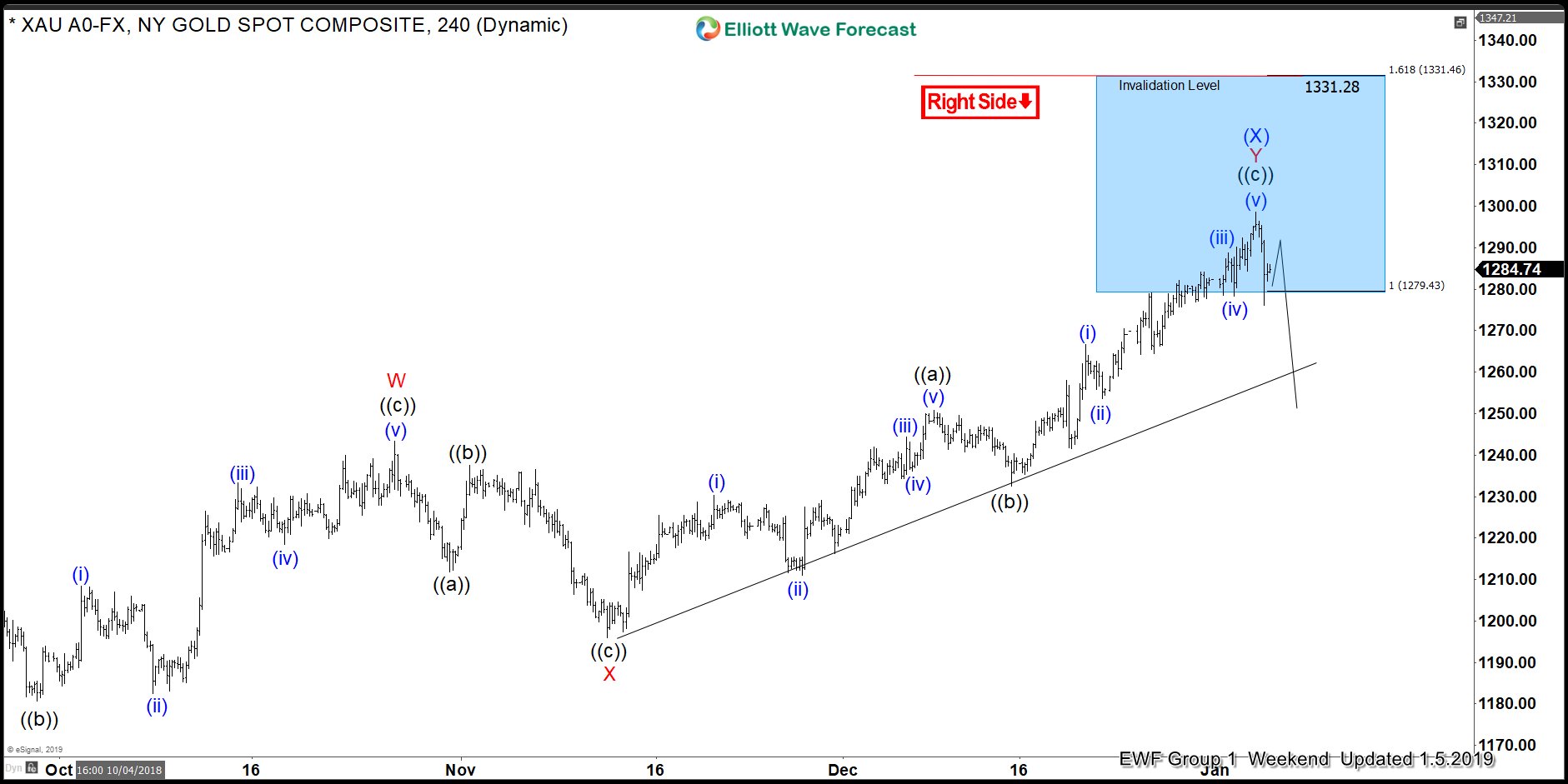 The bottom in XAU/USD at $1,160.37 on 8/16/2018 signifies the Intermediate degree wave (W) of the proposed Primary degree wave ((Y)). Since then we’ve been plotting for 3 distinct swings higher. These Minor degree waves W, X, and Y would complete Intermediate degree wave (X) before a move lower in XAU/USD.