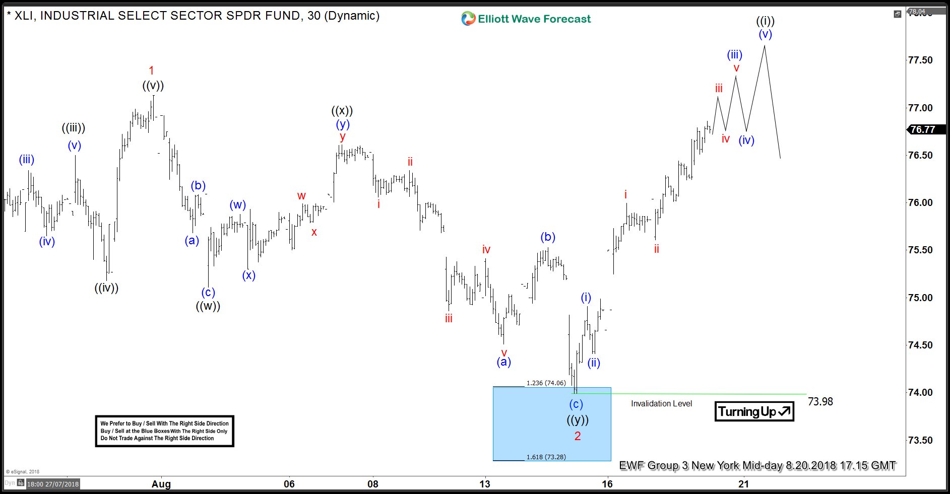 Hello fellow traders. In this blog, we will have a look at some past Elliott Wave charts of the Industrial Select Sector (XLI) which we presented to our members in the past. Below, you see the 1-hour updated chart presented to our clients on the 08/13/18 showing that XLI ended the cycle from 06/27 low in red wave 1.