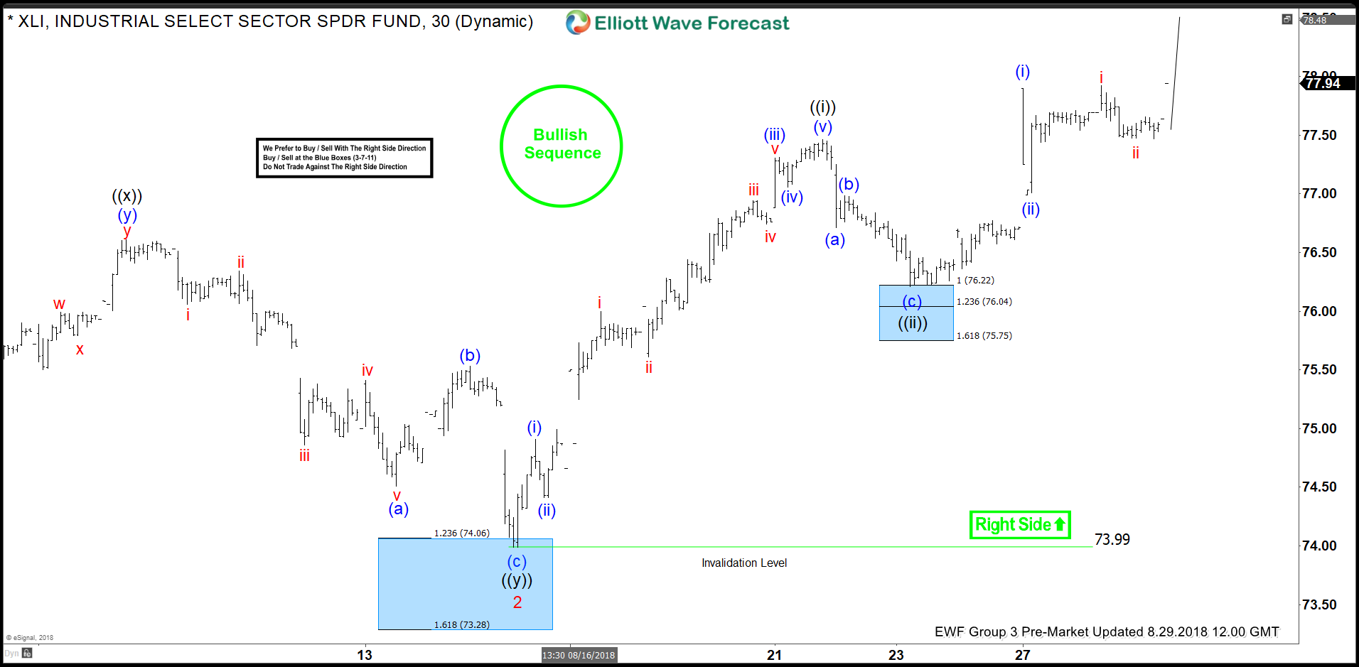As XLI ended the cycle from 06/27 low, at the high of 77.13 (07/31 peak). It started a pullback lower in red wave 2. The pullback proposed to unfolded as an Elliott Wave ZigZag structure. The right side in the 4H timeframe was at that time to the upside. So we advised members that we like buying XLI at the equal legs from 07/31 peak. Therefore, we expected buyers to appear in the dips in the sequences of 3, 7 or 11 swings. At the 100 – 1.236 Fibonacci extension of black ((a))-((b)). Which came at around 74.55-7406 area. And that was the first area for buyers to appear to take prices to new highs above red wave 1 peak or a larger 3 waves bounce at least.