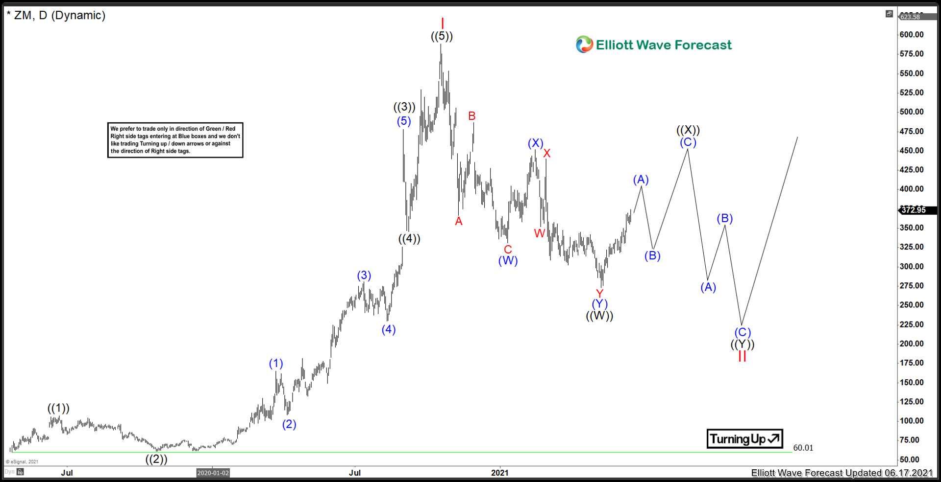 Long term term view from 4/20/2019 IPO lows of 60.61. Firstly, this stock is favoured to be correcting the whole cycle since that 2019 low (all time low). Wave ((1)) is set at 107.34 in June 2019 and wave ((2)) at 60.97 in October 2019. After that, an extended Black ((3)) took place, which peaked on 09/01/2020 at 478. From there, Black ((4)) at found a low on 9/08/2020 @ 345. After that, one final rally took place into Black ((5)) of Red I is favoured peaked 10/19/2020 at 588.84.