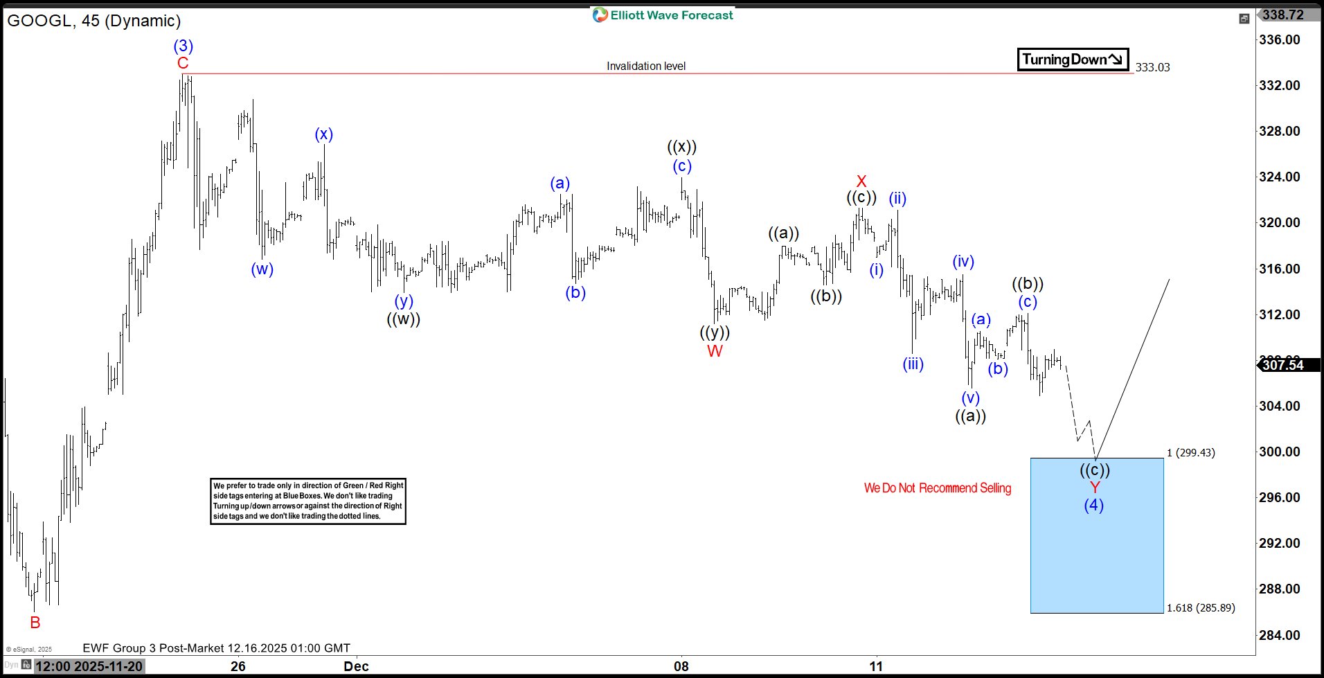 In the 1-hour Elliott Wave count from Dec 16, 2025, we saw that $GOOGL completed a 5-wave impulsive cycle at blue (3). As expected, this initial wave prompted a pullback. We anticipated this pullback to unfold in 7 swings, likely finding buyers in the equal legs area between $299.43 and $285.89.