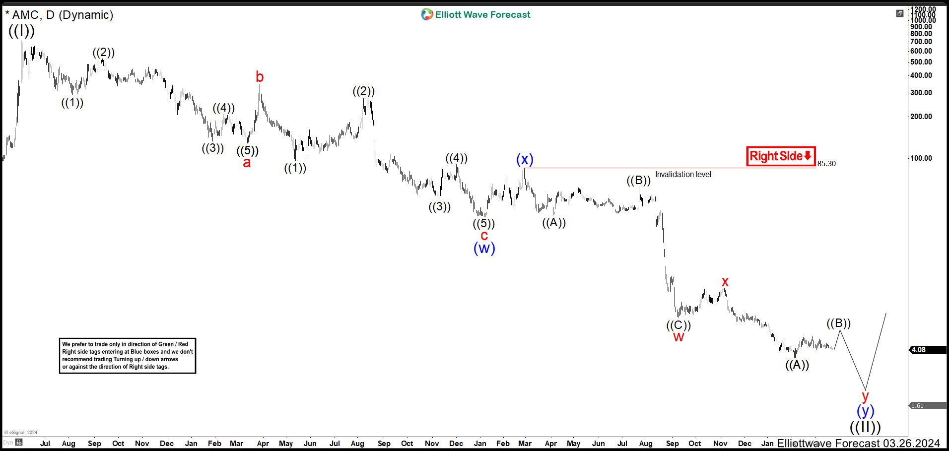 How you can see the forecast wave ((5)) has extend to much. You can think: “The structure is still an impulse,” but in this case not. If you check the RSI in daily timeframe, the RSI has erased divergence with a clear break. Therefore, that means there are 5 swings down from wave (x), but not an impulse rather these are part of a double correction. That is why we change the abc structure for a wxy structure. We can see 3 swings lower to end wave w at 7.05 low and wave x connector ended at 11.13 high. Now, we need 3 more swings lower complete the structure and the whole correction as wave ((II)). The first leg lower ended at 3.59 low as wave ((A)) and currently we are bulding wave ((B)) bounce. This wave ((B)) could end in 5.41 – 6.38 area, where AMC is going to give us a great opportunity to sell the market in wave ((C)) lower.