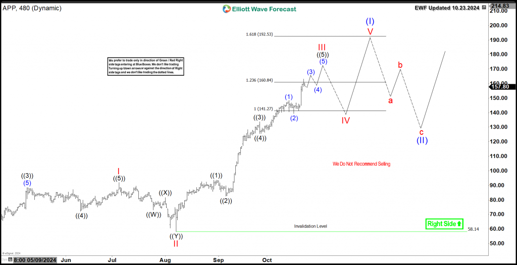 APP is currently showing 5 swings within cycle from August low and it’s extending within wave ((5)) of III. Therefore, the stock will be looking to end the 5 waves advance from 8/7/2024 and then a correction in wave IV will take place. The stock is expected to remain supported above $58.14 and consequently buyers will be looking to enter after 3 , 7 or 11 swings pullback.