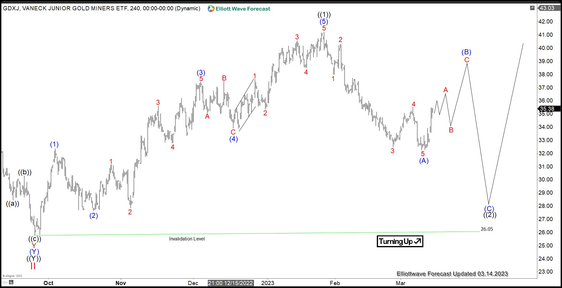 4 Hour Elliott Wave chart of GDXJ above shows the decline from wave ((1)) looks to be in 5 waves impulse and ended wave (A) at 32.25. This suggests that we can’t rule out another leg lower in wave (C) to correct cycle from 9.27.2022 low. Expect however any pullback to find support against 26.05 for further upside. We expect wave ((2)) correction to end sometimes this year and the rally to take place afterwards.