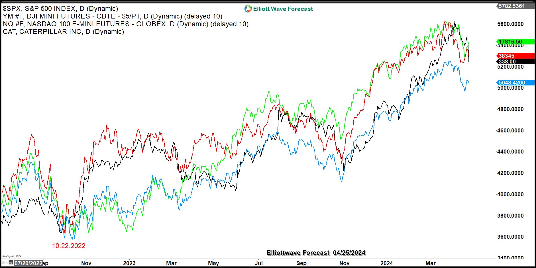 The following chart shows Google, CAT, SPX, DOW, and Nasdaq, all trading within the cycle since 10.2022.