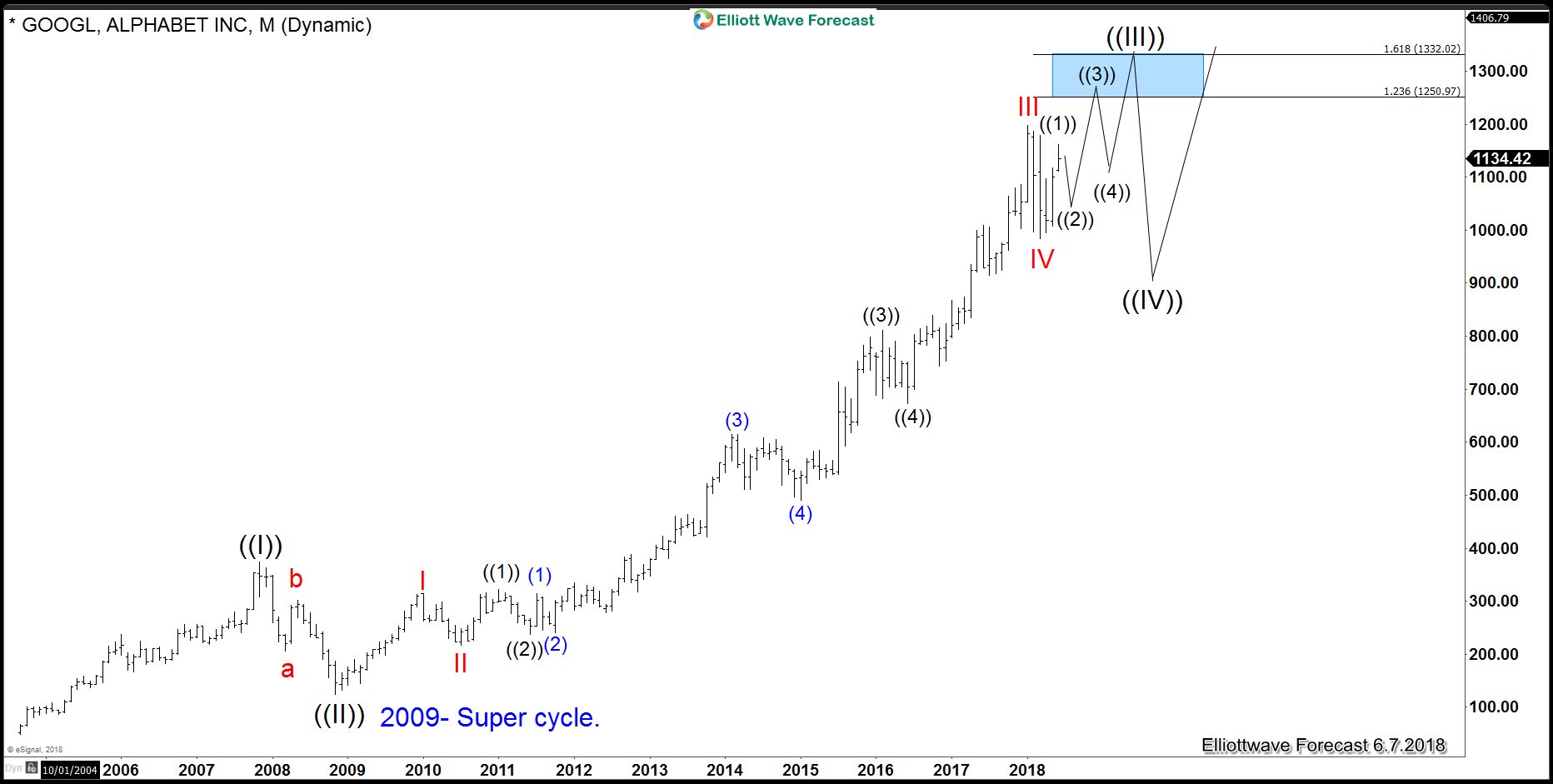 As can be seen in the chart above, we are labelling the rally from all-time low as an impulse Elliott Wave Structure. The stock is proposed to be in super cycle degree wave ((III)). The rally to $1179.86 on January 2018 high ended Cycle Degree wave III of ((III)), and the pullback to $980.64 on March 2018 low ended Cycle Degree wave IV of ((III)). While pullback stays above $980.64, expect Google to extend higher to $1250.97 – $1322.02 to end Cycle Degree wave V of ((III)). Then the stock should pullback in Super Cycle degree wave ((IV)) to correct cycle from 2009 low before the rally resumes. We don’t like selling the stock.