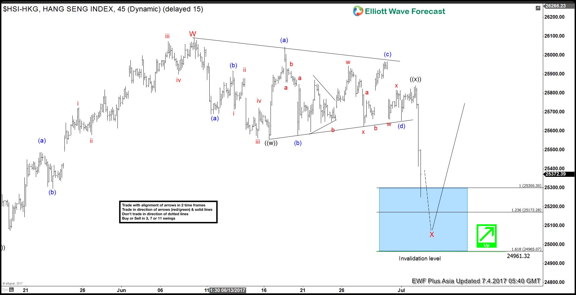 As our members know, Hang Seng was showing bullish swings sequences in higher time frames. Consequently, we recommended our members not to sell the index and keep buying the dips in 3,7,11 swings. As Hendra explained in the video, X red connector was expected to complete at the equal legs from the peak. We have advised our members to buy dips at 25297-24965.7 area, when invalidation level was at 24961.3.