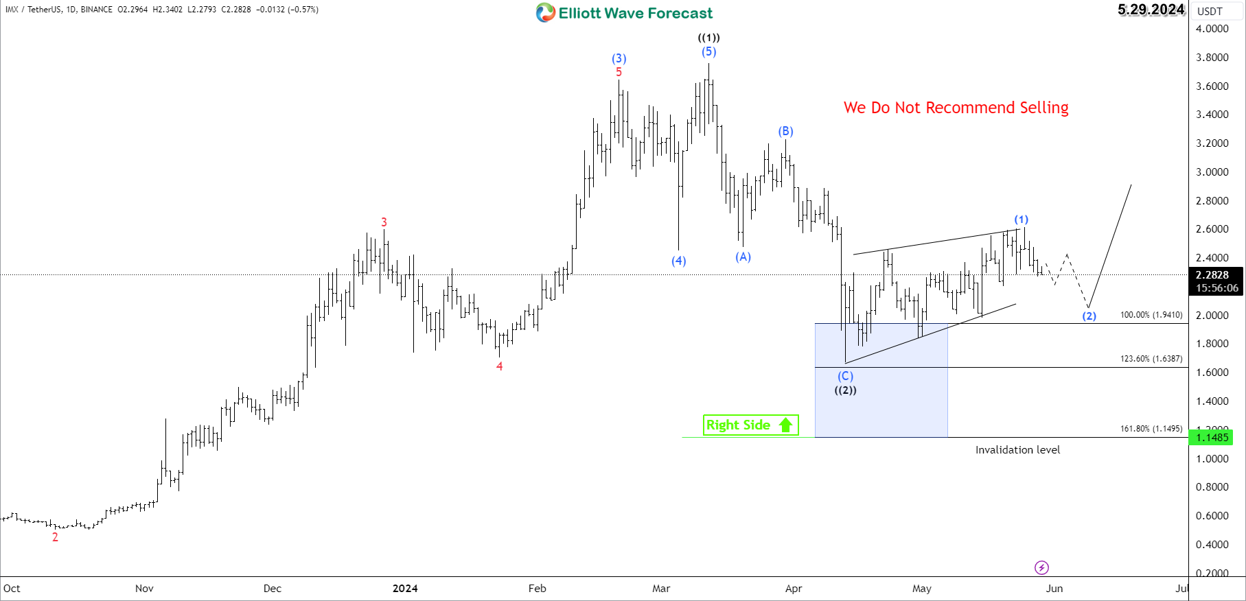 Since December 2022, IMX rallied higher within a regular impulsive 5 waves structure. This move established the wave ((1)) after +900% to the upside and it reached a high of $3.76 in March 2024. Down from there, IMX started a corrective 3 waves decline within a ZigZag structure to correct the entire rally.