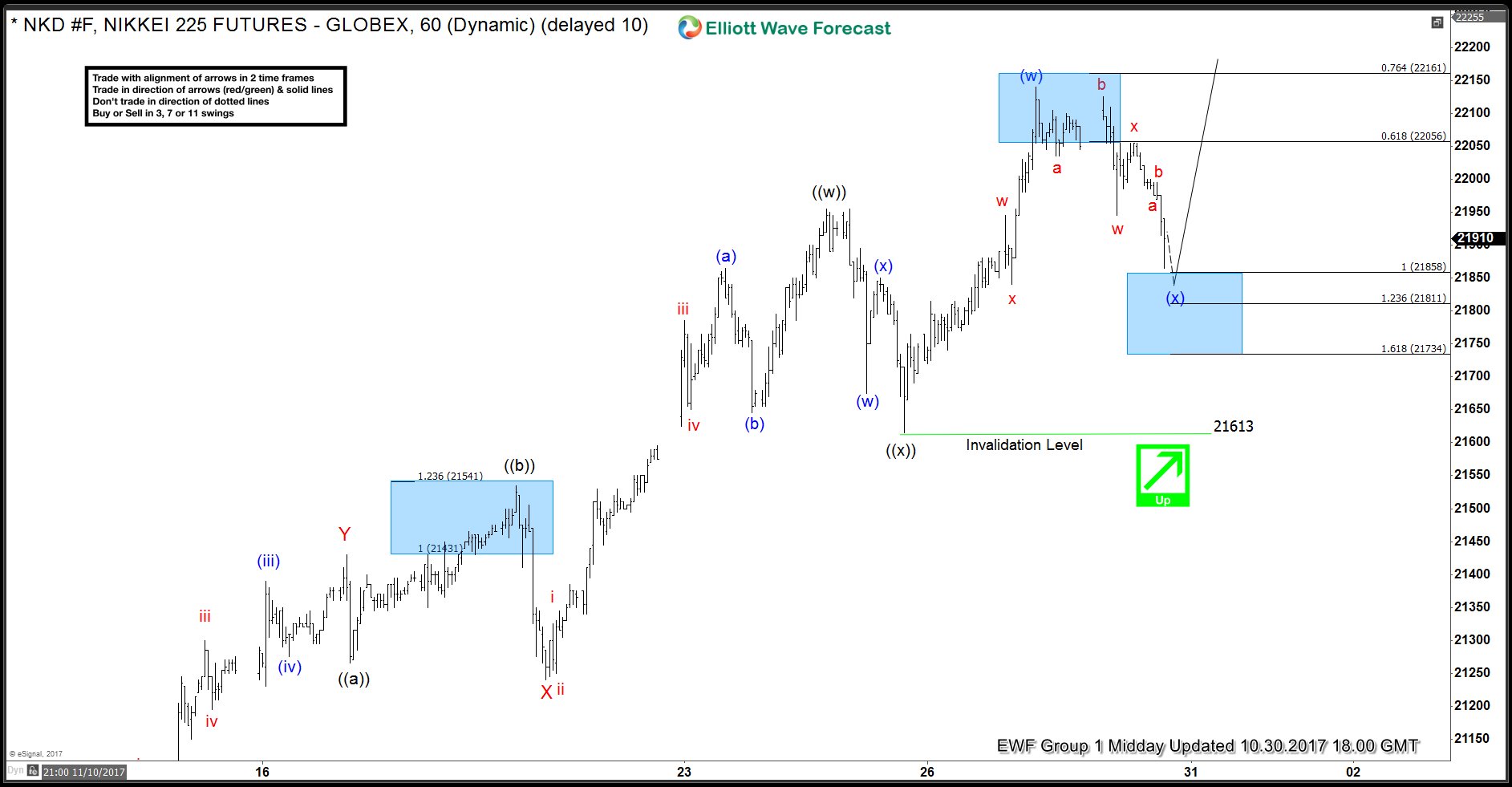 In the Live Trading Room on 10/30, we told members to buy the dips in Nikkei in 3, 7, or 11 swing as it has incomplete bullish sequence and the target hasn’t been reached in the Daily Chart. The Index made another leg lower during the day and we executed the long trade at blue box at 21865. Below is the video clip of the Live Trading Room where we explained to our members how to execute the trade and manage the risk afterwards.