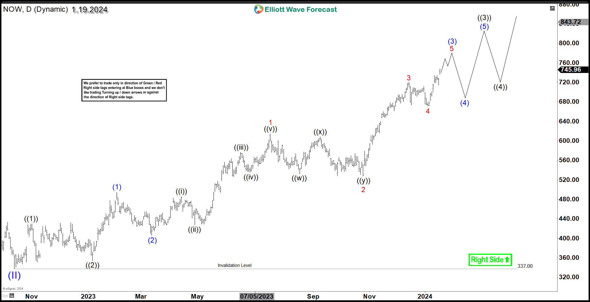 Since October 2022 low, NOW clearly established a nesting structure within an impulsive cycle to the upside and it’s already passed the phase of the strongest rally in wave 3. The current move is proposed to be wave 5 of (3) and within the coming weeks a 3 waves pullback in wave (4) is expected to take place. Furthermore, any type of pullback is expected to remain corrective in 3 , 7 or 11 swings for the stock to maintain the bullish trend.