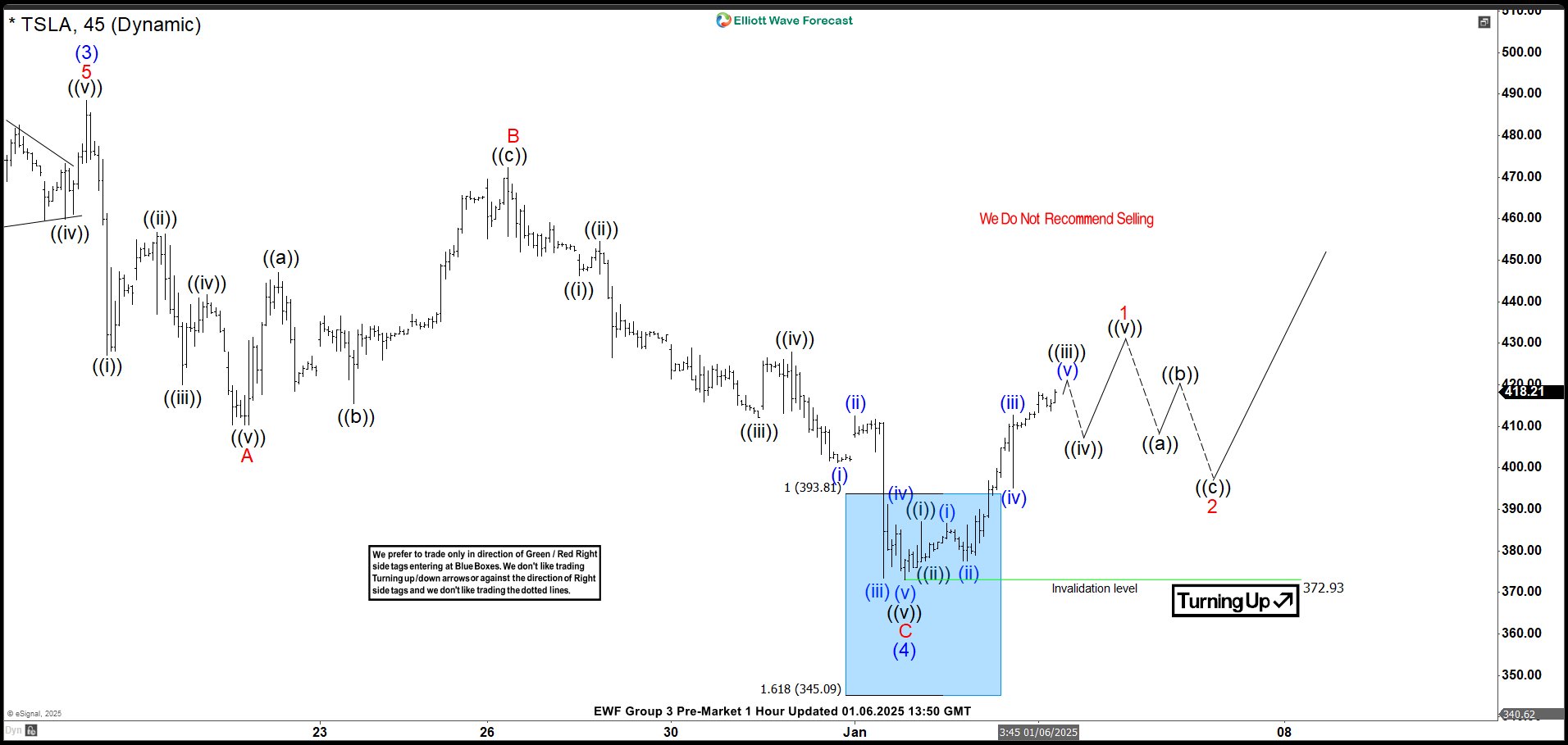 In the 1-hour Elliott Wave count from December 31, 2024, we see that $TSLA completed a 5-wave impulsive cycle beginning on November 27, 2024, and ending on December 18, 2024, at the blue (3). As expected, this initial wave prompted a pullback. We anticipated this pullback to unfold in 3 swings, likely finding buyers in the equal legs area between $393.81 and $345.09.